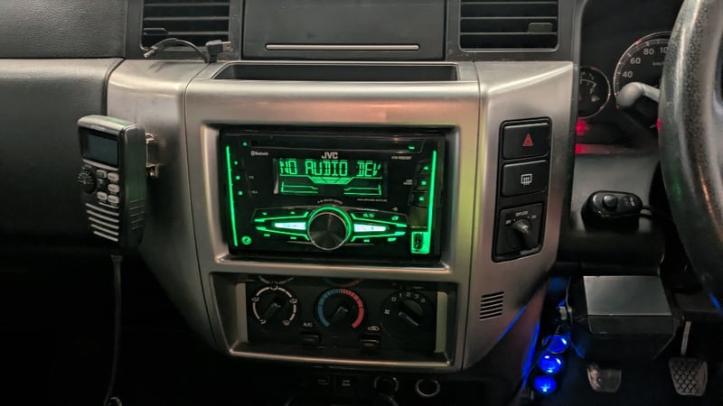 The vendor has fitted a new fuel pump and a 2-inch lift kit. The engine bay is tidy and houses a dual battery system for running accessories in the field. The exterior is clean and well-maintained for the mileage. A Safari snorkel is fitted to the passenger A-pillar. All-terrain tyres are shod on factory alloy wheels. The interior features a JVC Bluetooth head unit, GME UHF CB radio, and a dash mat protecting the upper dashboard. The cargo area has checker-plate aluminium floor protectors. An Adventure Kings awning mounts on the passenger side of the Tracklander roof rack. LED work lights are mounted to the rack for camp lighting. The bull bar accommodates two large round LED driving lights and integrated fog lights.