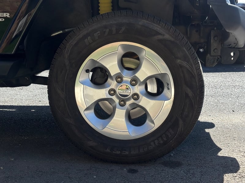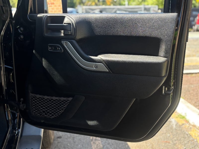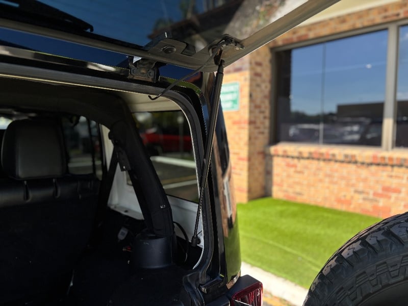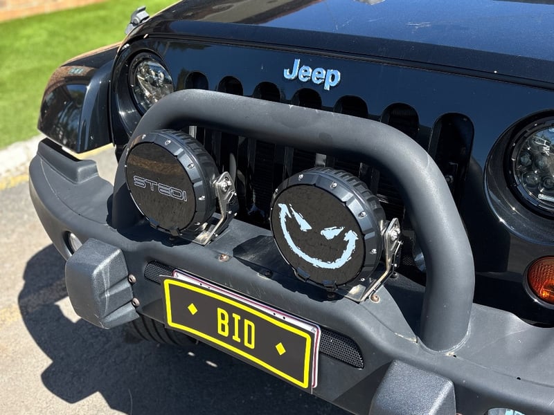 This example presents in gloss black with the Overland oval badge on the rear quarter and "Wrangler Unlimited" script on the front door. Factory 18-inch alloy wheels are in good overall condition. The previous owner has fitted a steel tubular bull bar with two STEDI dual driving spotlights, and upgraded to LED projector headlights with halo DRL rings. A MOLLE utility panel is mounted to the inside of the tailgate for gear organisation. Chrome shift knobs are fitted to both the automatic transmission selector and the transfer case lever. Under-floor cargo storage holds recovery and emergency gear. The service book is present with stamped entries recorded to 144,230km at Cricks Highway Subaru, with prior Jeep dealer servicing at Springwood Chrysler Jeep recorded at 92,722km.
