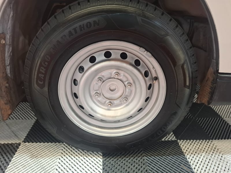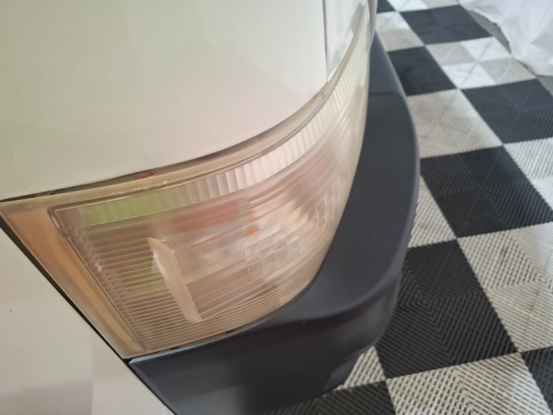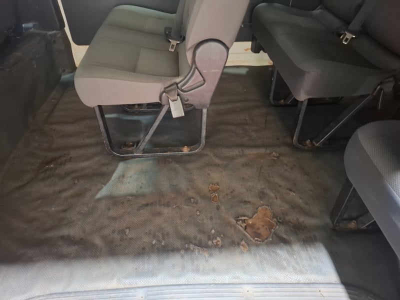 The white body presents well for its age and kilometres, with panels consistent and no signs of major collision damage. Minor dents are present on the driver's side door. The wiper arms show surface rust and the headlights have yellowed over time, both typical for a vehicle of this vintage. Inside, the bus carries 12 passenger seats, rubber floor mats, and multiple overhead storage shelves. The headliner carries staining from commercial use and the floor lining has sustained tears throughout. The rear boot panel shows water damage, as the vendor discloses honestly. The fire extinguisher is in place and the log books and owner's manual are with the vehicle.