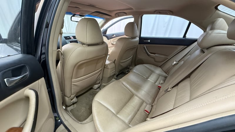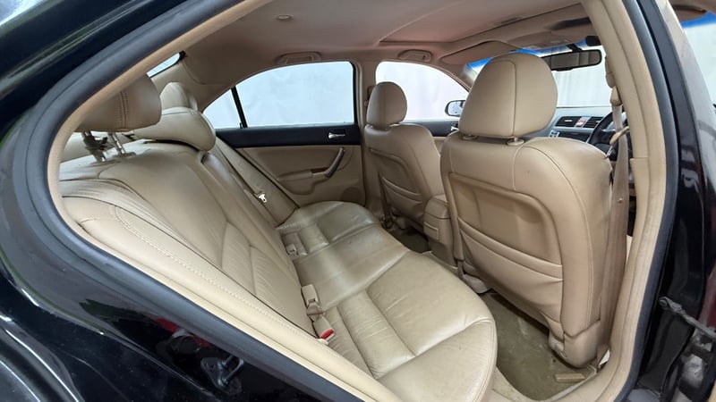 The cabin is the standout feature. Tan leather interior throughout with wood-grain trim on the dashboard, centre console, and door cards. The spec includes a factory sunroof, dual-zone automatic climate control, factory 6-disc CD/AM-FM head unit, power-adjustable front seats, and factory alloy wheels. The rear tan leather seats are in solid condition with only light wear. The dashboard is crack-free, which is notable for a 2007 vehicle in the Queensland climate. The engine bay shows no active fluid leaks and the i-VTEC valve cover presents cleanly. The paint condition on the horizontal surfaces requires honest disclosure: the bonnet shows significant clear-coat oxidation and fading throughout its surface. The roof panel has clear-coat peeling across a substantial area toward the rear. The boot lid has extensive paint delamination affecting the majority of its surface, exposing primer and bare areas. The rear bumper has a crack at the lower left corner. The driver's seat leather shows surface cracking and wear on the outboard bolster, consistent with 220,683km.