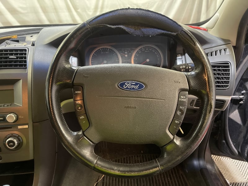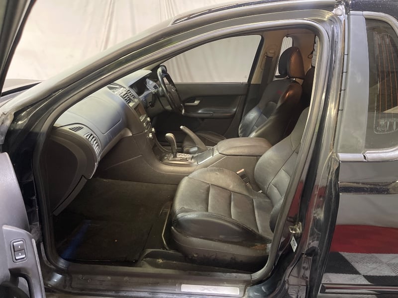 Photos show this Black BA MKII XR8 Ute in honest, road-ready condition. The cabin panels carry good gloss and the XR8-spec dark five-spoke alloys are fitted and present well. The tray panels show clear coat deterioration consistent with sun exposure over 20 years. The rear bumper bar is absent, a known missing item. A tonneau cover is fitted and a tow bar has been added. Dual chrome aftermarket exhaust tips are present. Inside, the black leather cabin shows age-appropriate wear with some cracking on the driver's seat bolster and the steering wheel leather peeling at the twelve o'clock position. Two remote key fobs and an owner's manual pack are included. Vendor advises the timing chain has been replaced. Vendor advises the brakes require bleeding. Vendor advises window switches are not seated in the door panels.