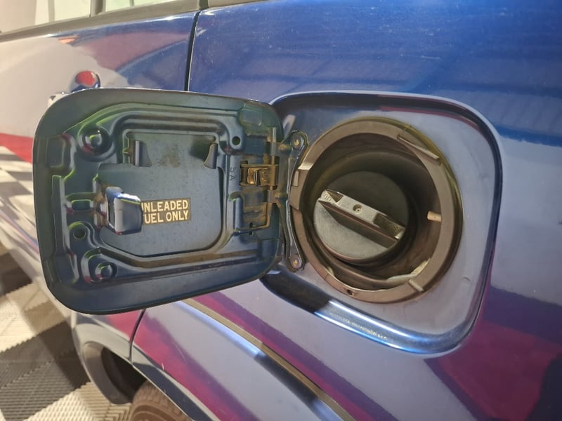 Photos show this Dark Blue Mica Cruiser presenting with a well-preserved interior and honest exterior wear consistent with its kilometres. The cabin presents in good condition with dark grey cloth throughout, all four power windows functional, and climate control confirmed operational. The driver's instrument cluster reads 277,320 km as confirmed from the odometer photo. The tailgate-mounted spare tyre cover has paint peeling on its surface, a common age-related issue with these hard covers from prolonged Queensland sun exposure. Headlights and fog lights show yellowing on the lens plastic consistent with 20-plus years of age. The alloy wheels show surface deterioration on their finish but are structurally intact, fitted with Yokohama Geolandar SUV tyres with remaining tread. Compliance plate in the engine bay confirms model ACA23R-AWPNKQ, engine 2AZ-FE 2362mL, colour 8M6 (Dark Blue Mica), built December 2003. Vendor advises interior shows minor wear and tear and exterior paint has fading with scratches and scuffs.
