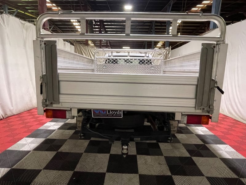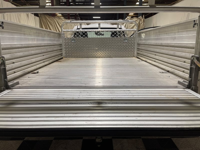 The vehicle has been fitted with a full aluminium work tray, including 3-way drop sides capable of holding up to 600kg per vendor, a tubular aluminium ladder and pipe rack, and a chequerplate headboard with diamond mesh window and tie-down points. A towbar with ball hitch sits at the rear. A bonnet protector, fire extinguisher, and UHF whip antenna round out the commercial fitout. Inside, the cab is functional and tidy with cloth seating, manual climate controls, a touchscreen head unit with Bluetooth connectivity, and a multifunction steering wheel. The engine bay is clean and unmodified. Vendor advises a self-loading tail-lift is fitted (not visible in photo gallery - confirm with inspection).
