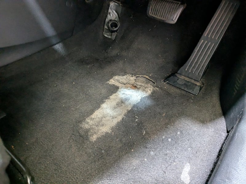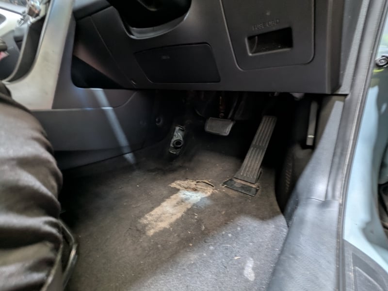 This example presents in Clean Blue, a factory metallic finish confirmed from the manufacturer's plate as paint code SU9. Body panels are straight with consistent gaps and no visible accident damage. Vendor discloses paint flaking and surface rust on the rear passenger-side quarter panel above the wheel arch. Roof clear coat has failed extensively across the roof surface, with the base coat exposed over most of the panel. Rust is also present at the rear roof seam. Both of these are confirmed from photos and represent material condition issues. Alloy wheels show moderate kerb rash on multiple spokes. Rear parking sensors are confirmed as fitted. AUX, USB, and iPod connectivity are confirmed from photos. Aftermarket seat covers are fitted to all four seats, with the condition of the original cloth upholstery beneath not fully assessable from photos. Driver's footwell carpet is heavily worn through to backing. Engine bay is dirty but no visible fluid leaks are evident.