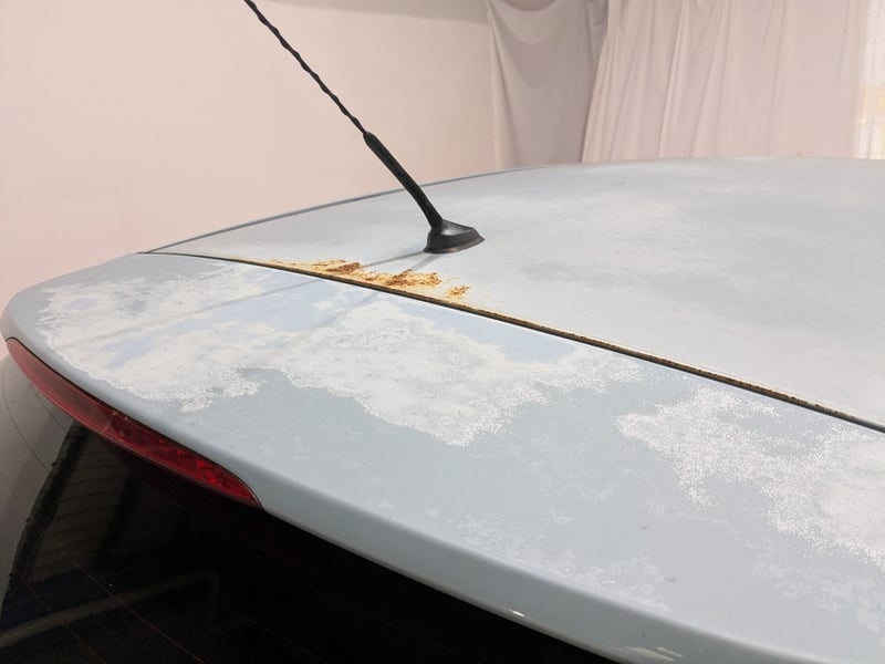 * Roof clear coat has failed across most of the roof surface with base coat exposed. Rust is present at the rear roof seam.
