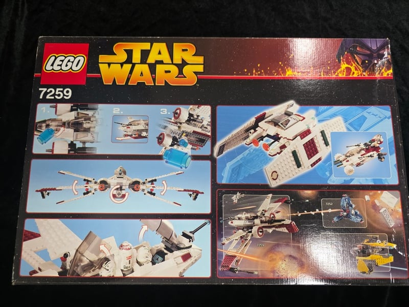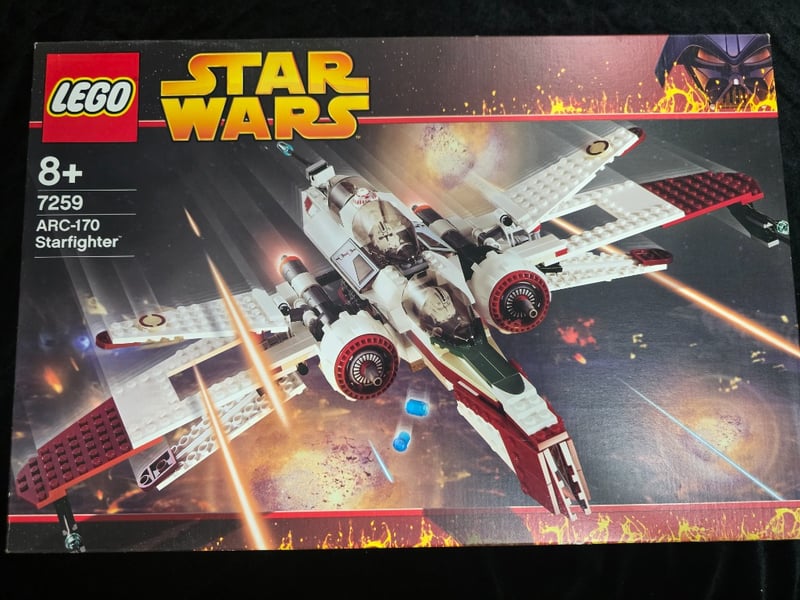 Lego Star Wars Set 7259 Featuring The Arc-170 Starfighter, A Detailed Spacecraft Model With White And Red Colour Scheme, Poseable Wings, Rotating Engines With Red Detailing, Opening Cockpit Canopy, And Included Minifigures. Set Includes Instruction Manual And Original Packaging With Age Recommendation 8+. Classic Star Wars Themed Construction Set Showcasing The Iconic Three-Engine Attack Starfighter With Functional Moving Components.