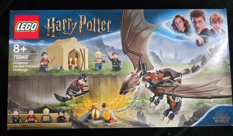 Lego Harry Potter Set 75946 Featuring The Hungarian Horntail Dragon From The Triwizard Tournament. Includes Articulated Dragon Figure With Poseable Wings And Limbs, Golden Tent Structure With Opening Doors, And Four Minifigures (Harry Potter, Viktor Krum, Fleur Delacour, And Cedric Diggory). Complete With Golden Egg Accessory, Flame Elements, And Chain Details. Suitable For Ages 8+. Wizarding World Licensed Collectible Building Set In Excellent Display Condition.