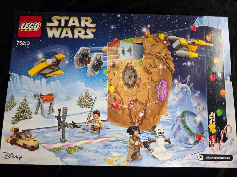 Lego Star Wars Advent Calendar 75213 Featuring 24 Daily Surprises With Minifigures Including Han Solo, Rey, And Bb-8. Includes Thematic Builds Such As Starships, At-At Walkers, And Festive Desert And Winter Scene Elements. Set 6-14 Years Age Range. Original Retail Packaging With Intact Box Displaying Complete Front And Back Artwork Depicting Holiday-Themed Star Wars Universe Scene.