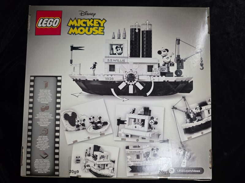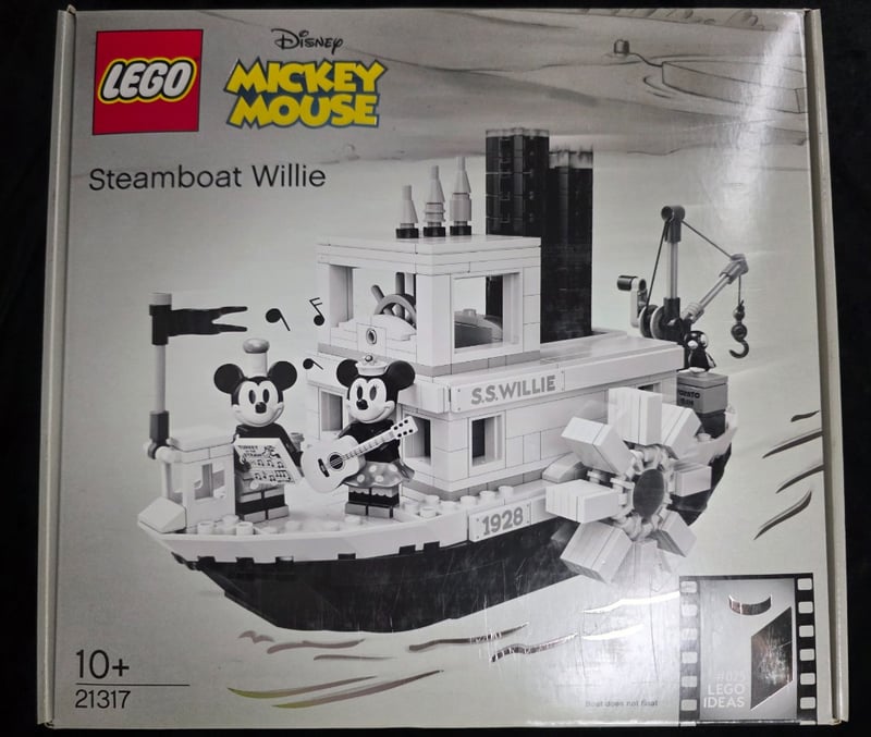 Lego Ideas Disney Mickey Mouse Steamboat Willie Set (21317) Featuring Detailed Recreation Of The Iconic 1928 Steamboat With Articulated Crane, Dual Smokestacks, And Pilot Cabin. Includes Two Classic Mickey Mouse Minifigures With Period-Appropriate Accessories. Boxed Set Configured For Display With Multiple Configuration Options Shown. Vintage-Inspired Black And White Color Scheme With Nostalgic Detailing. Adults-Oriented Building Set (10+ Rating) Celebrating Disney'S Animation Heritage.