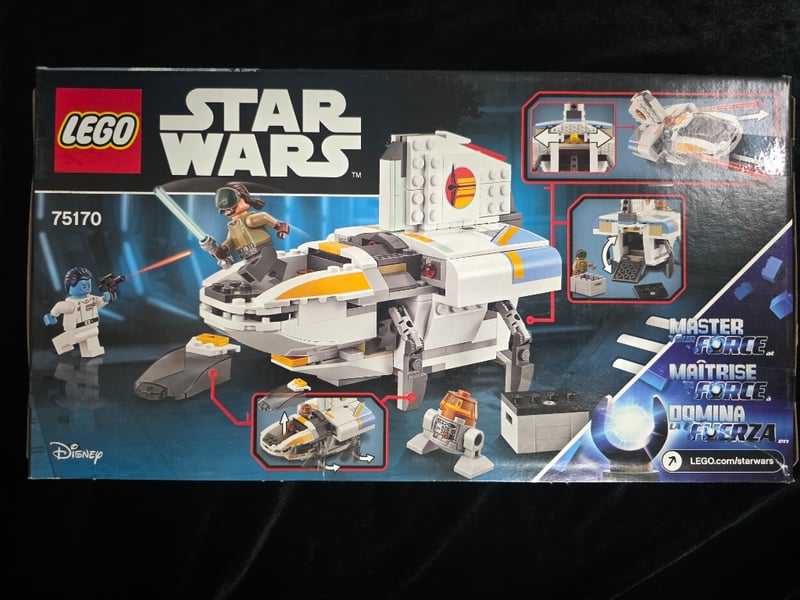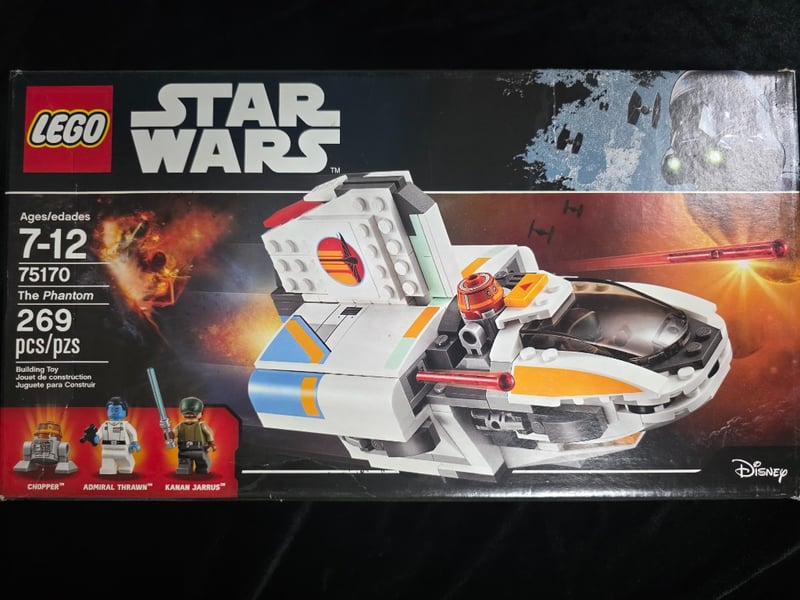 Lego Star Wars Set 75170 "The Phantom" Spacecraft Model Featuring 269 Pieces With Three Minifigures (Chopper, Admiral Thrawn, And Kanan Jarrus). Original Boxed Set For Ages 7-12, Includes Detailed Starship Construction With Opening Cockpit, Rotating Weapon Turret, And Deployable Landing Gear. Includes R2-D2 Droid Figure And Instruction Booklet. Condition Reflects Vintage Collectible Status With Slight Box Wear Consistent With Storage.