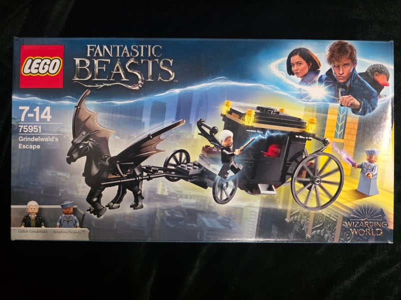Lego Fantastic Beasts Set 75951 Featuring Grindelwald'S Escape Carriage With Winged Creature, Minifigures Including Colleen Grindelwald And Seraphina Picquery, Black Magical Carriage With Yellow Accents, Detailed Spell Effects, And Accessories. Age Range 7-14. Complete With Original Packaging Showing All Components And Build Configurations.
