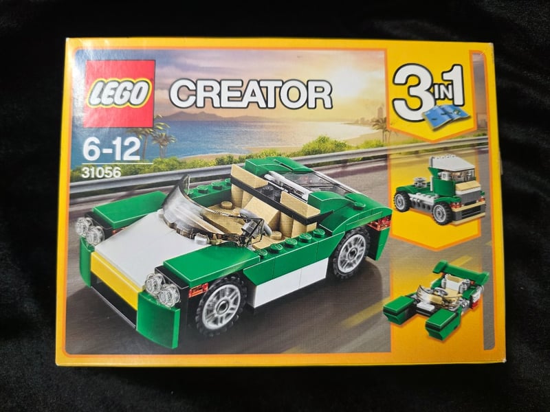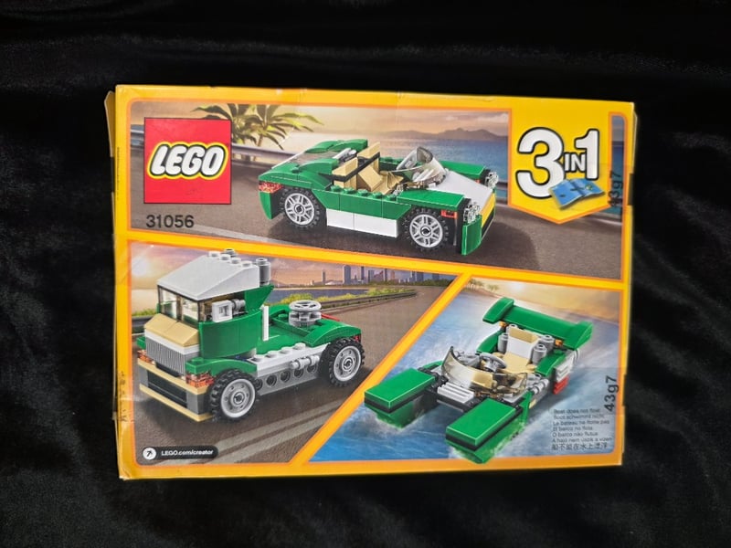 Lego Creator 3-In-1 Set #31056 Featuring Convertible Sports Car, Dump Truck, And Speedboat Configurations. Original Yellow Box With Age-Appropriate Labeling (6-12 Years). Three Buildable Models Demonstrating Creative Versatility. Collector'S Item From Mid-2010S Era.