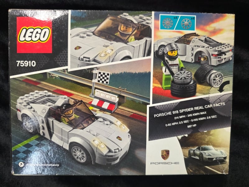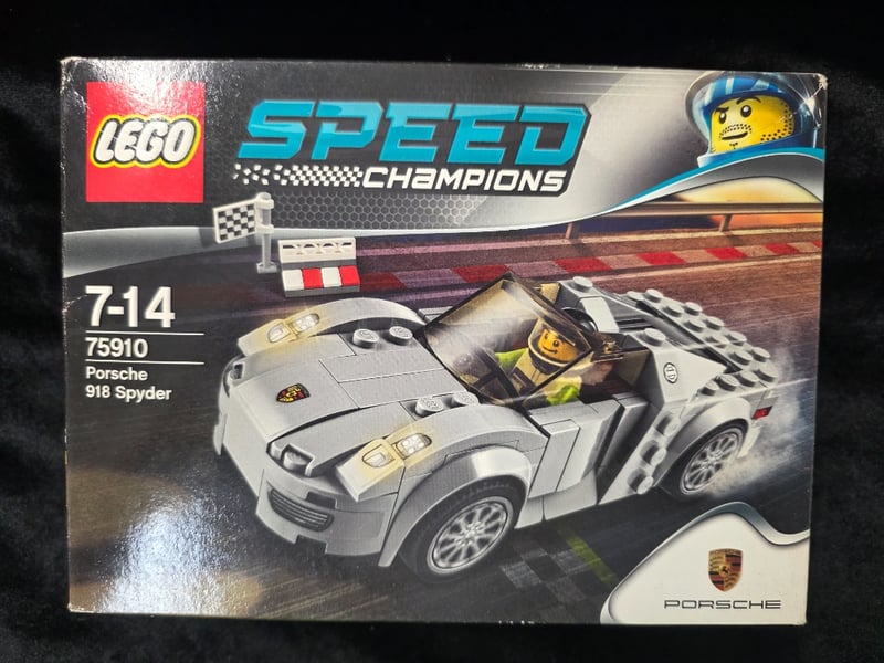 LEGO SPEED CHAMPIONS PORSCHE 918 SPYDER SET 75910 Item Size: Height: 7cm, Width: 15cm, Depth: 30cm, Weight: 0.1Kg Lego Speed Champions Set 75910 Featuring A Detailed White Porsche 918 Spyder With Opening Canopy, Gold-Trimmed Elements, And Minifigure Driver. Includes Race Track Barriers, Checkered Flag, And Spare Tire. Box Shows Minor Wear Consistent With Age And Display. Specifications Highlight Authentic Porsche Performance Data (214 Mph Top Speed, 0-60 Mph In 2.5 Seconds). Age-Appropriate For Ages 7-14. Comes With Original Packaging Featuring Vibrant Race-Themed Graphics And Porsche Branding. Condition: Good - Refer To Images 655508+68