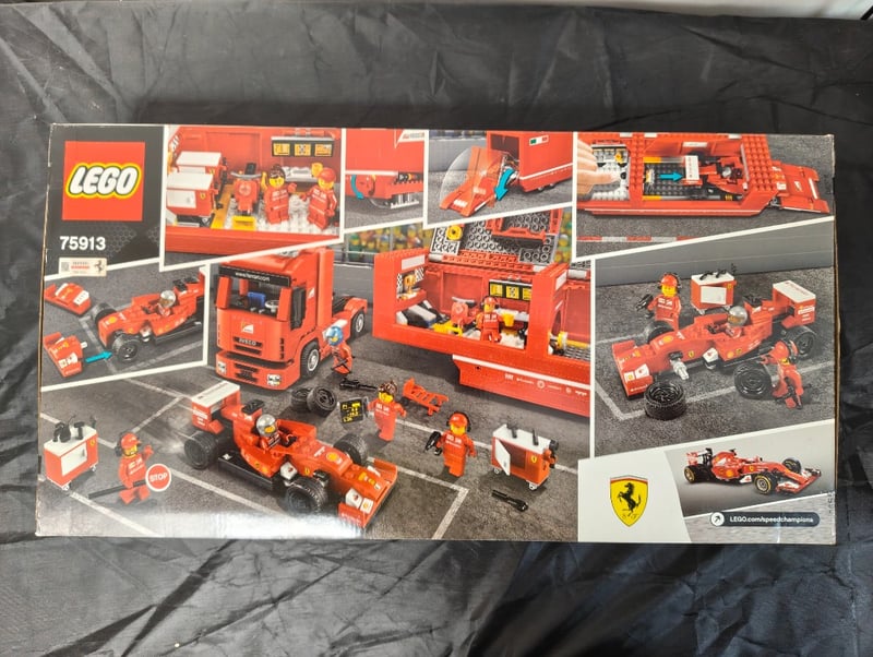 Complete Lego Speed Champions Set 75913 Featuring A Detailed Ferrari F1 Racing Truck With Integrated Workshop, Formula 1 Race Car, Minifigures, And Comprehensive Pit Crew Accessories. Includes Transport Truck With Opening Sides, Functional Pit Equipment, And Authentic Ferrari Branding Throughout.