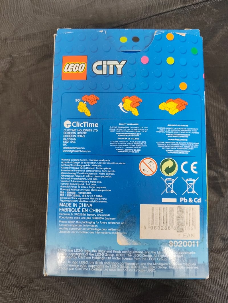 Lego City Fireman Themed Buildable Watch (Set 8020011) Comprising 30 Pieces With Minifigure And Modular Lego Components. Features A Functional Analog Timepiece With Firefighter-Themed Dial In Red And Orange Tones, Accompanied By A Yellow And White Firefighter Minifigure With Printed Details, Plus Additional Lego Bricks In Orange, Yellow, And White For Customizable Watch Band Construction. Manufactured By Clictime Under Lego Group License. Includes Original Packaging With Multilingual Instruction