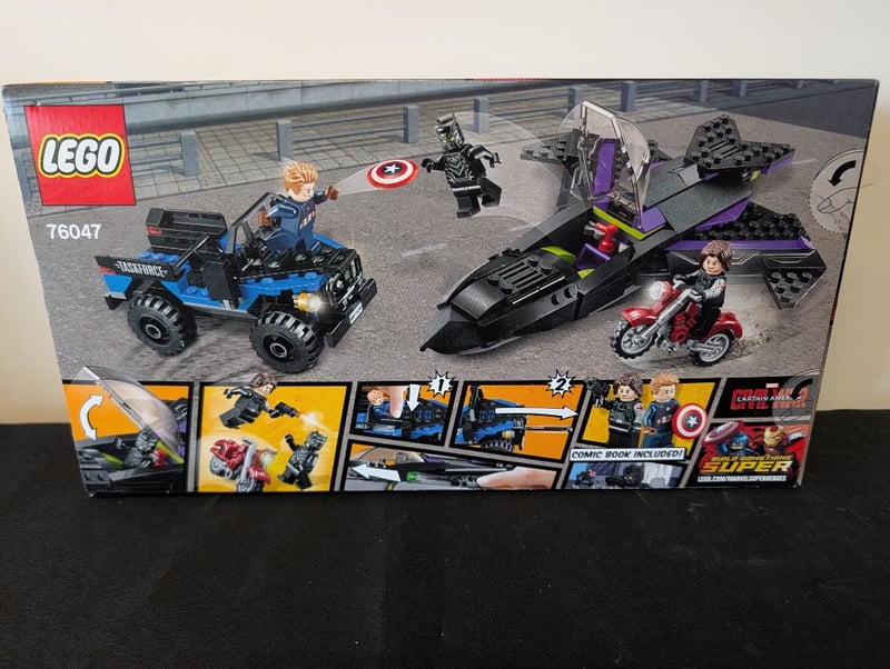Lego Marvel Super Heroes Set 76047 Featuring Black Panther Pursuit Theme. Includes Buildable Black Panther Jet Aircraft With Purple And Black Detailing, Captain America'S Blue And Black Armored Truck, Red Motorcycle, And Three Minifigures (Black Panther, Captain America, And Additional Character)