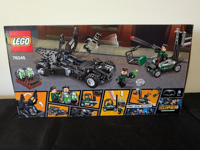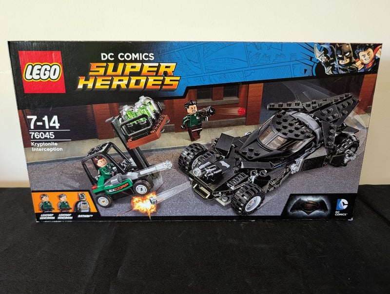 Complete Lego Dc Comics Super Heroes Set 76045 Featuring The Kryptonite Interception Theme. Includes Black Batmobile With Detailed Construction, Green Lex Corp Hover Vehicle, Minifigures (Lex Luthor, Batman, And Additional Hero Figures), Kryptonite Element With Display Base. Set Demonstrates Excellent Architectural Design With Functional Wheels And Poseable Components. Suitable For Ages 7-14.