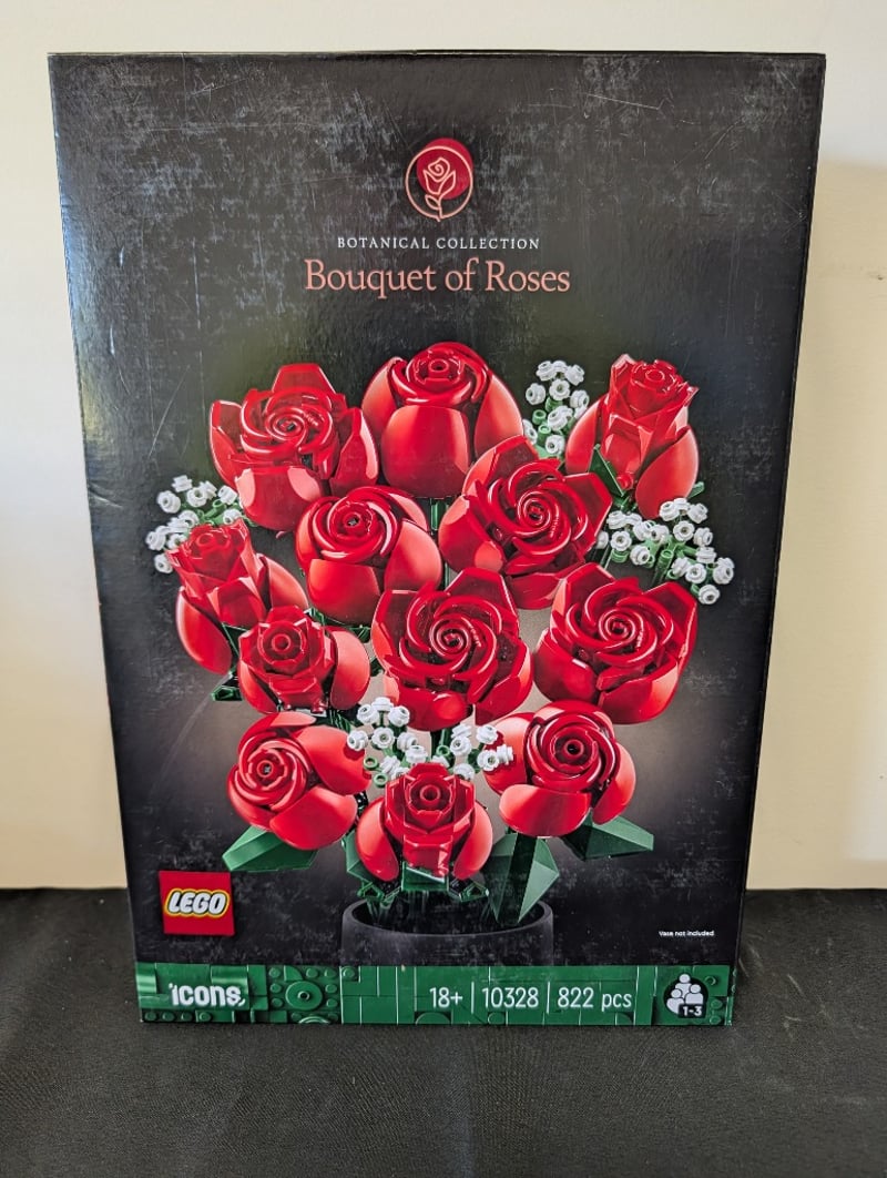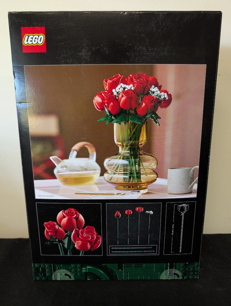 Lego Icons Botanical Collection Bouquet Of Roses (Set 10328) Featuring 822 Pieces. This Adult-Oriented Building Set Constructs An Elaborate Floral Arrangement Of Red Roses With White Baby'S Breath Filler Flowers And Green Stems, Presented In A Glass Vase With Decorative Base. Includes Detailed Instruction Manual And Display Components. Designed For Age 18+. Original Packaging Shows Detailed Product Imagery On Reverse With Assembly Variations And Finished Display Options.