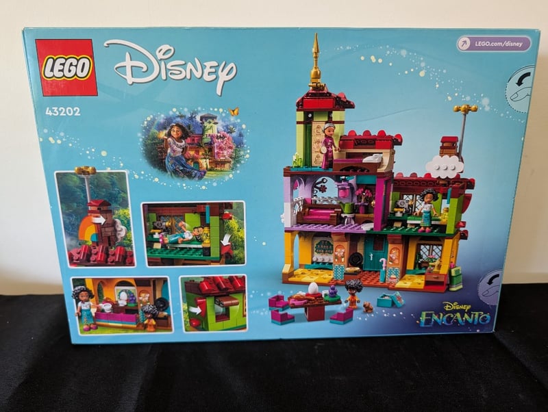 Lego Disney Encanto Magical House Building Set #43202 Featuring The Vibrant Multi-Level Casa With Colorful Architectural Elements, Including Lime-Green Towers With Red Tile Roofing, Pink And Purple Accents, And Gold Spire Detailing. Set Includes Minifigures And Decorative Flora Elements Depicting The Enchanted Colombian-Inspired Residence From Disney'S Encanto Film. Original Factory Sealed Packaging With Comprehensive Instruction Materials Visible On Reverse. Suitable For Ages 6 And Above.