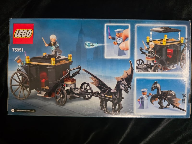 Lego Fantastic Beasts Set 75951 Featuring Grindelwald'S Escape Carriage With Winged Creature, Minifigures Including Colleen Grindelwald And Seraphina Picquery, Black Magical Carriage With Yellow Accents, Detailed Spell Effects, And Accessories. Age Range 7-14. Complete With Original Packaging Showing All Components And Build Configurations.