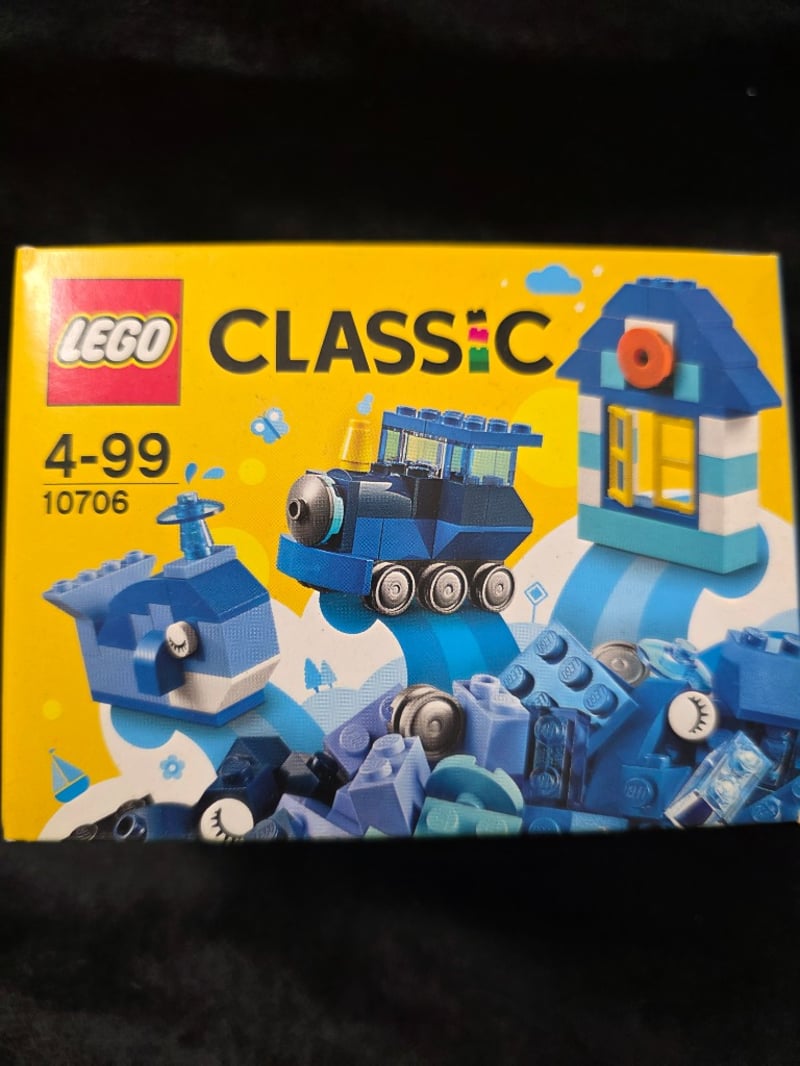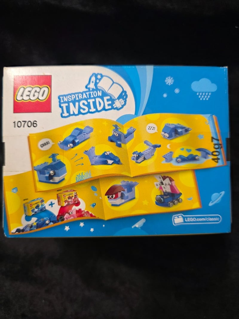 LEGO CLASSIC BLUE CREATIVITY BOX SET 10706 Item Size: Height: 10cm, Width: 10cm, Depth: 20cm, Weight: 0.1Kg Lego Classic Set 10706 Featuring Blue-Themed Bricks And Pieces. Original Yellow Box With Age-Appropriate Construction Elements Including A Train, Lighthouse, And House Structure. Includes Instruction Booklet With "Inspiration Inside" Design Guidance. Set Intended For Ages 4-99. Sealed Plastic Bag Contains Assorted Blue, White, And Turquoise Bricks With Wheels And Specialty Pieces. Condition: Good - Refer To Images 655508+73
