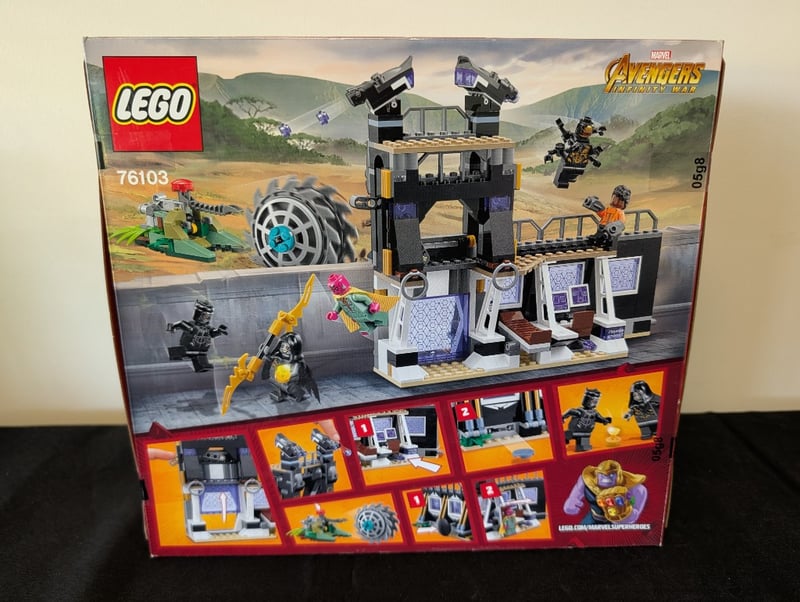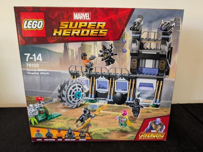 Lego Marvel Super Heroes Set 76103 Featuring The Corvus Glaive Threshold Attack Playset From Avengers Infinity War Collection. Includes Multi-Level Fortress Structure With Rotating Turrets, Launching Weapon Elements, Minifigures (Vision, Black Panther, Shuri, Corvus Glaive, Outrider), Large Mechanical Wheel Piece, And Accessory Components. Original Sealed Packaging With Age-Appropriate 7-14 Years Rating Displayed On Box.