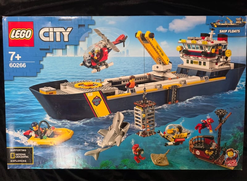 Lego City Set 60266 Featuring A Large Deep-Sea Exploration Vessel With Motorized Crane, Helicopter, Submersible, Rescue Boat, And Diving Equipment. Includes Minifigures For Maritime Rescue Operations And Underwater Discovery Missions. National Geographic Explorers Collaboration Set.