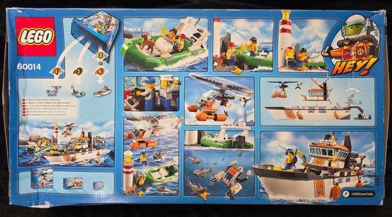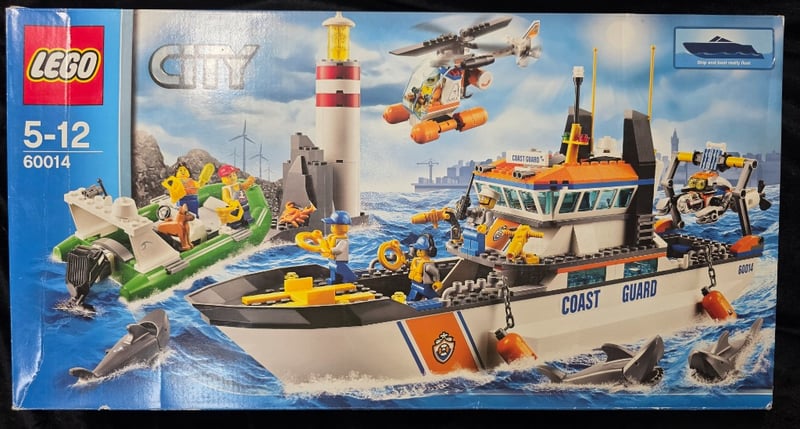 Lego City Coast Guard Headquarters Set (60014) Featuring A Multi-Vessel Rescue Base With Operational Coast Guard Ship, Helicopter, Rescue Boat, And Lighthouse. Includes Minifigures, Sharks, And Coastal Scenery Elements. Age Range 5-12 Years. Complete Boxed Set With Instruction Manual And Original Packaging Displaying All Included Components And Play Scenarios.