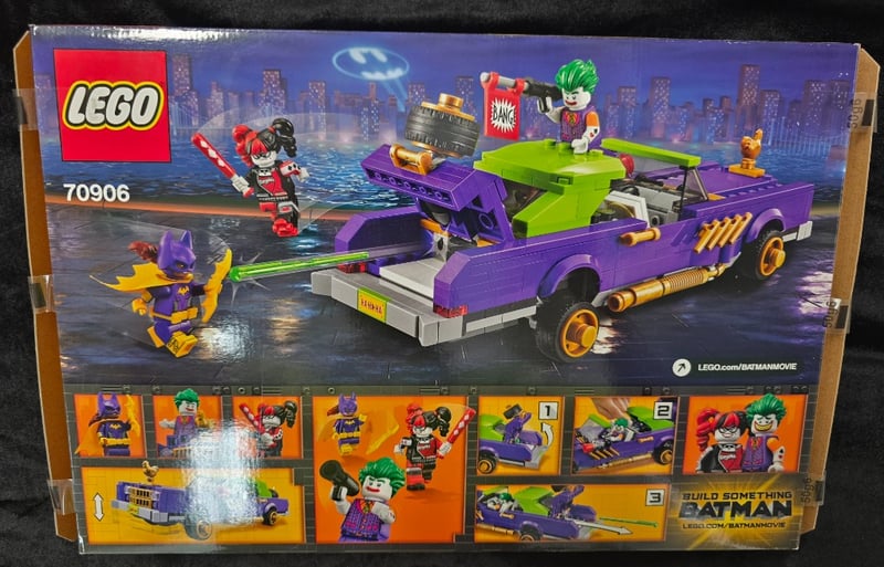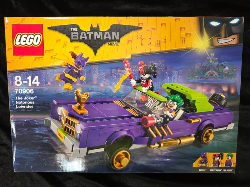 LEGO BATMAN MOVIE SET 70906 - THE JOKER NOTORIOUS LOWRIDERItem Size: Height: 28cm, Width: 38cm, Depth: 12cm, Weight: 0.2KgVintage Lego Batman Movie Set 70906 Featuring The Joker'S Iconic Purple And Lime-Green Lowrider Vehicle With Functional Catapult Launcher, Includes Three Minifigures (Batman, Harley Quinn, The Joker), Detailed Vehicle Construction With Adjustable Suspension Elements, And Original Retail Packaging With Intact Box Art And Instruction Materials.Condition: Good - Refer To Images584530+24