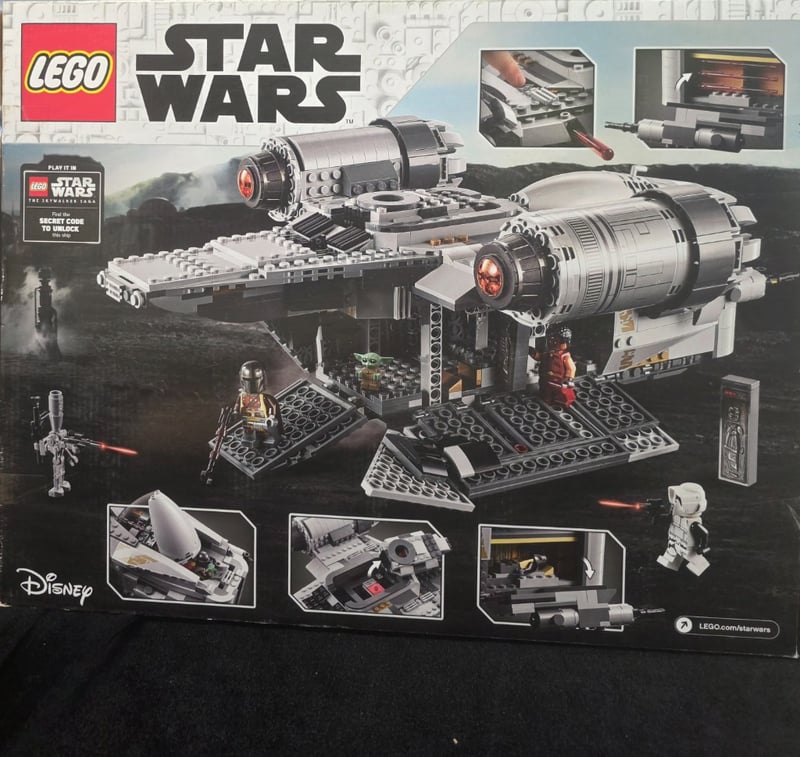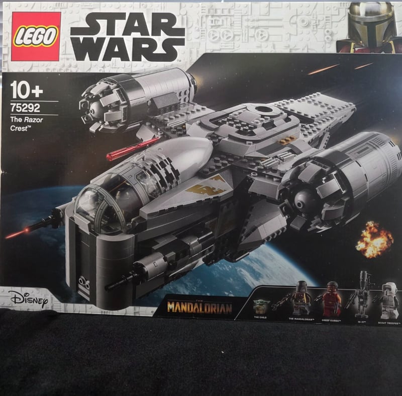 Factory-Sealed Lego Star Wars Set 75292 Featuring The Razor Crest Spacecraft From The Mandalorian Series. This Advanced Construction Set Includes Detailed Minifigures (The Child, The Mandalorian, Greef Karga, And Scout Trooper), Removable Cockpit Pod, Rotating Gun Turrets With Red Illumination Elements, Multiple Interior Chambers With Play Features, And Specialized Building Elements. Includes Secret Code Unlock Feature For Lego Star