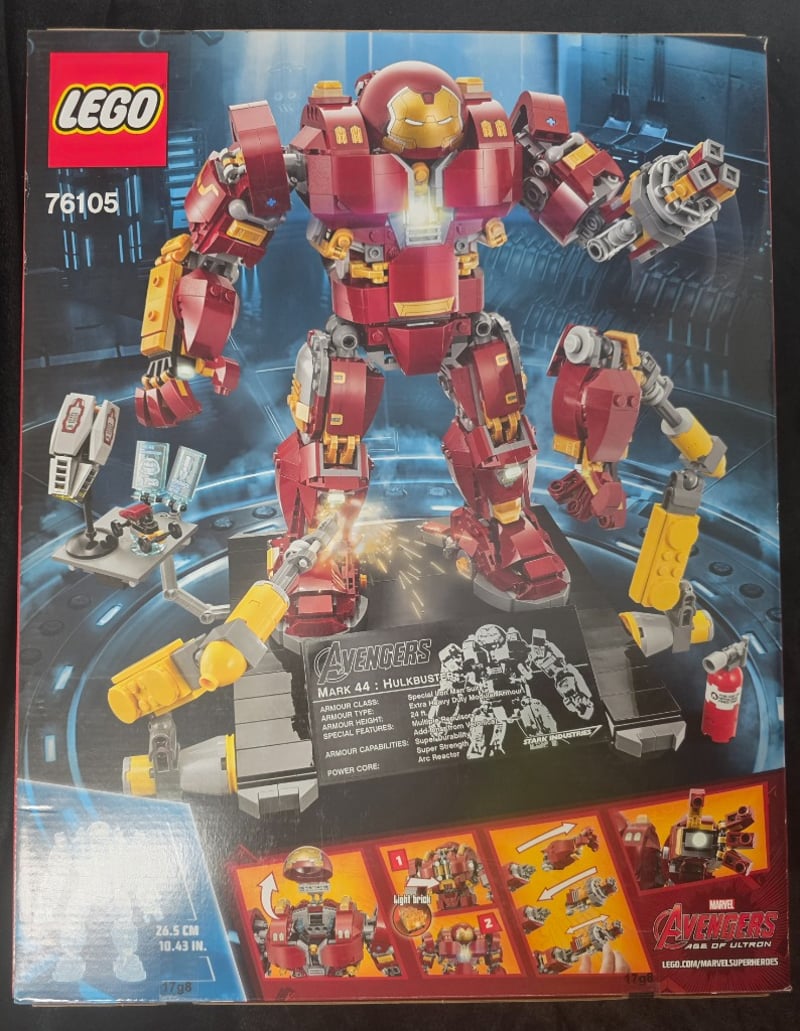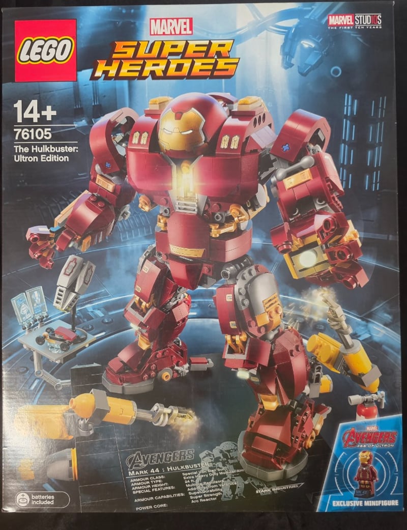 Lego Marvel Super Heroes Set 76105 Featuring The Hulkbuster Armor In Red And Gold Colorway With Motorized Functions, Articulated Joints, And Accompanying Minifigures Including Exclusive Iron Man Variant. Age 14+. Includes Instruction Manual And Original Packaging With Reference To Mark 44 Armor Specifications From