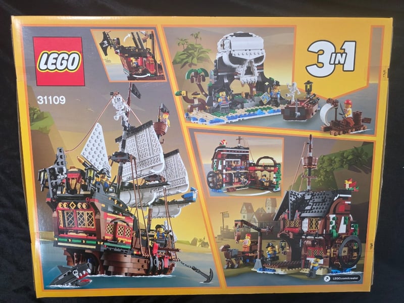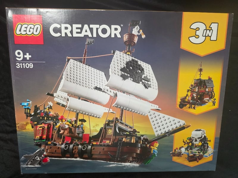 Lego Creator 3-In-1 Set #31109 Featuring A Detailed Pirate Ship With Articulated Sails, Intricate Rigging, And Removable Cabin Structures. The Set Offers Three Alternative Configurations Including A Haunted House And Skeletal Robot Figure. Includes Multiple Minifigures And Accessories. Designed For Ages 9+. Original Packaging Shows Comprehensive Imagery Of All Three Buildable Variations With Authentic Period Maritime Aesthetics And Gothic Architectural Elements.