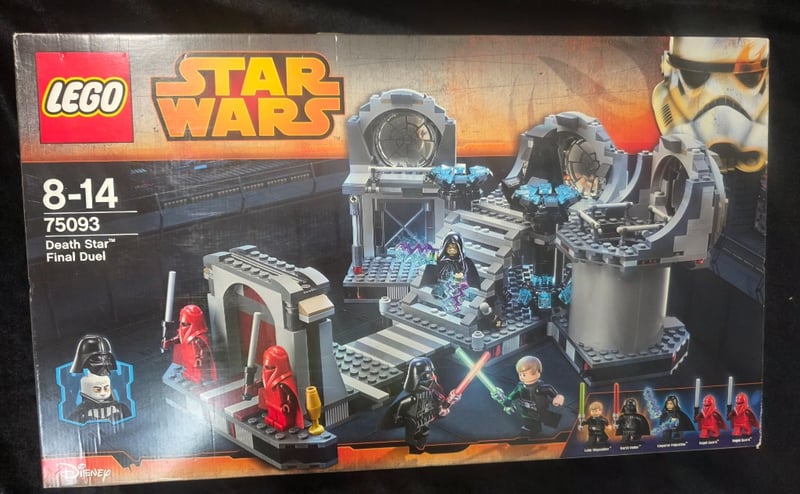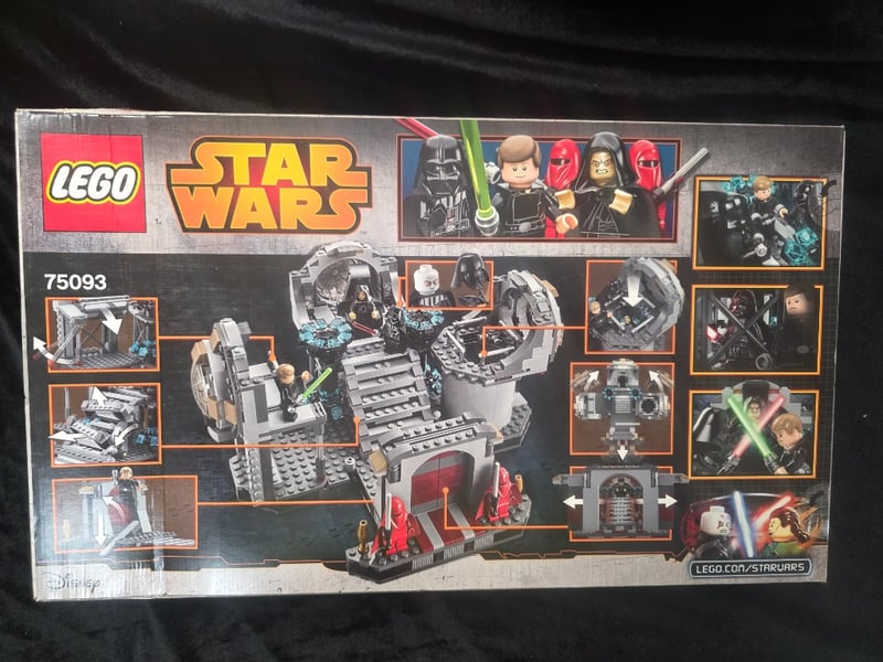 Complete Lego Star Wars Set 75093 Depicting The Iconic Death Star Final Duel Scene. Features Modular Construction With Rotating Spherical Sections, Multiple Minifigures Including Darth Vader, Luke Skywalker, Emperor Palpatine, And Imperial Guards. Original Retail Packaging With Age-Appropriate Rating 8-14. Includes Detailed Platform Structures, Lightsaber Accessories, And Authentic Star Wars Character Representations.