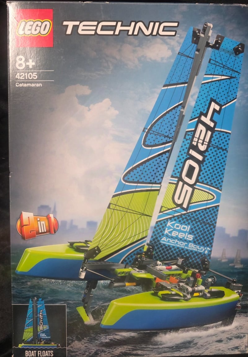 Lego Technic Set 42105 Featuring A Detailed Catamaran Sailing Vessel With Functional Rigging, Adjustable Blue And Lime-Green Sails, Twin Hulls With Boat Floats, And Motorised Components. Includes A Buildable Remote-Control Mechanism For Operational Steering. Age Recommendation 8+. Demonstrates Advanced Engineering Principles Through Construction Of A Multi-Configuration Water-Based Model.