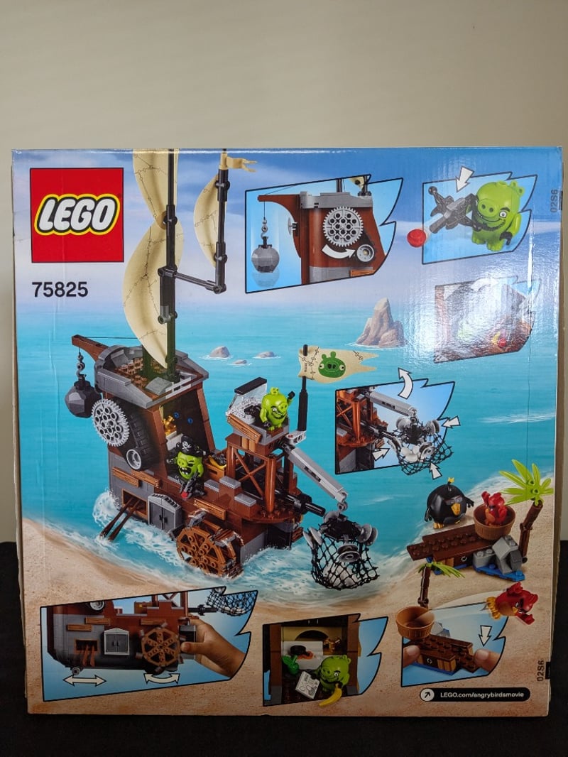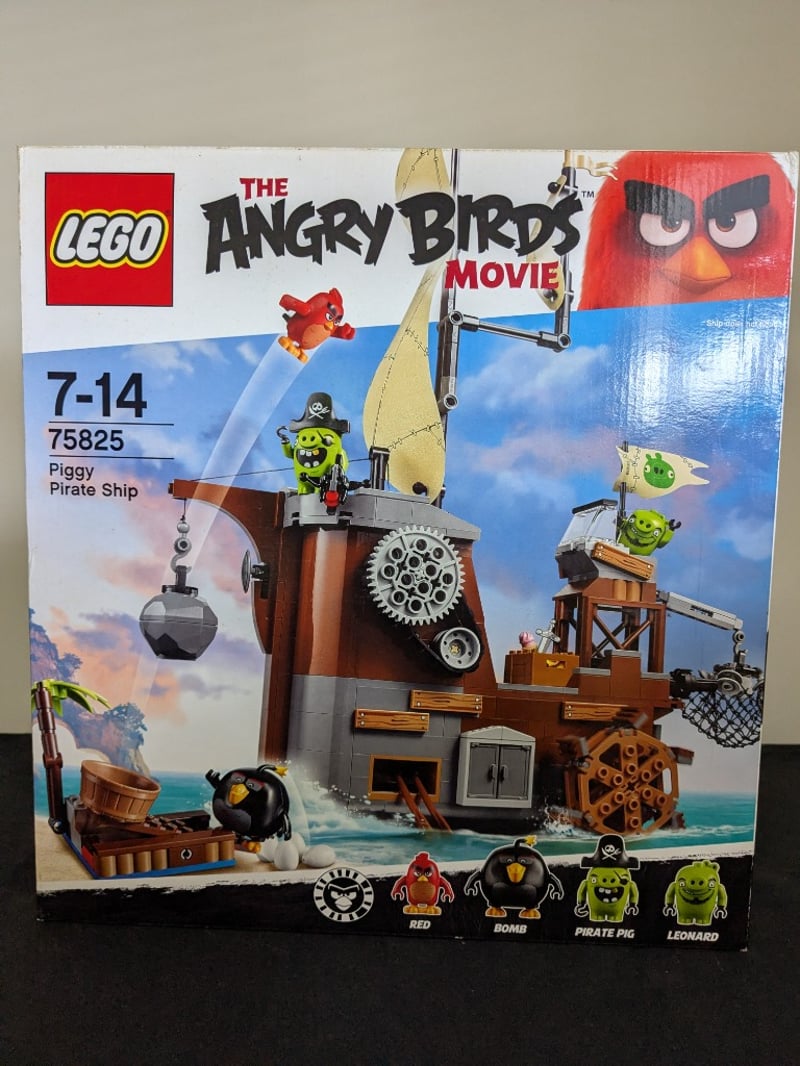 Lego Set 75825 From The Angry Birds Movie Franchise, Featuring The Piggy Pirate Ship. This Construction Set Is Designed For Ages 7-14 And Includes Minifigures Of Red, Bomb, Pirate Pig, And Leonard. The Set Comprises A Detailed Pirate Vessel With Functional Sail, Rotating Gear Mechanisms, Wrecking Ball Crane, And Ancillary Structures Including A Wooden Crate Platform. Features Include Motorized Elements, Opening Cabin Door, And Articulated Launching Mechanisms. Original Box Packaging Present With