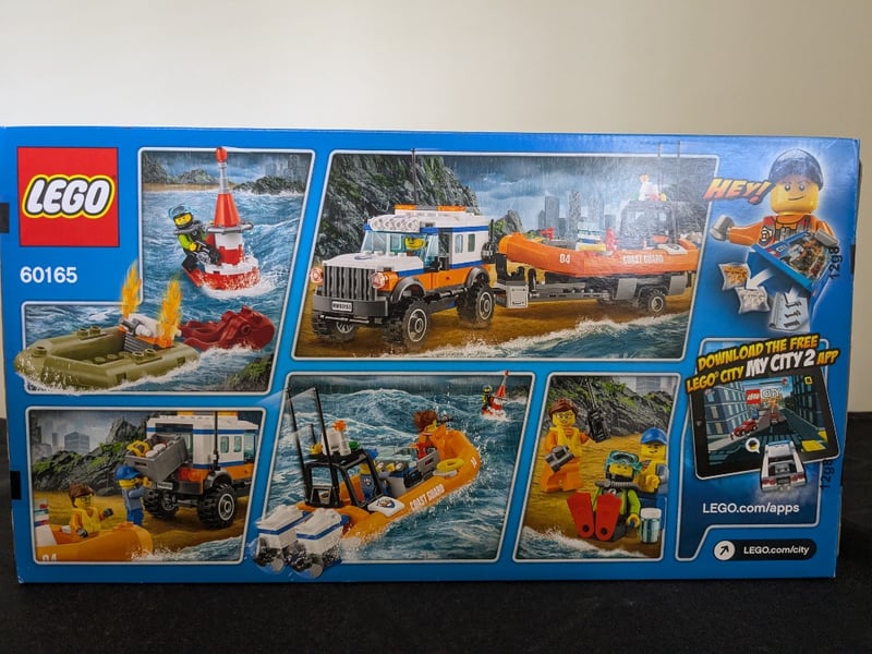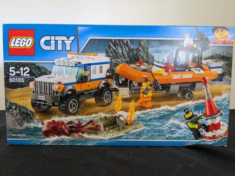 LEGO CITY COAST GUARD SET 60165 - COMPLETE BOXED SETItem Size: Height: 35cm, Width: 50cm, Depth: 12cmLego City Coast Guard Set 60165 Featuring An Orange And Blue Rescue Jeep With Trailer, Coast Guard Rescue Boat With Working Motor Function, Jet Ski, Inflatable Raft With Fire Elements, And Three Minifigures. Age 5-12. Original Sealed Box With Comprehensive Instruction Visuals.Condition: Good - Refer To Images584530+125