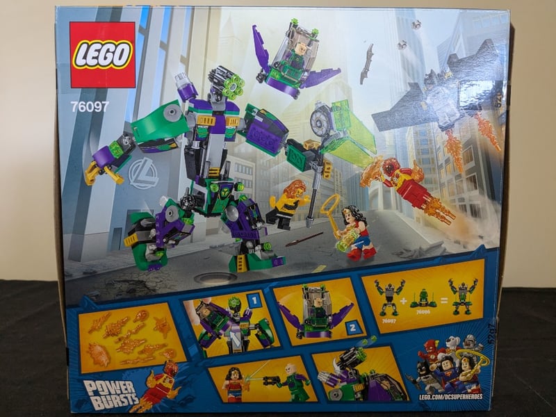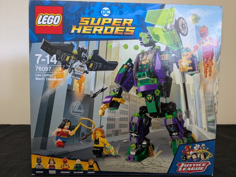 Lego Dc Super Heroes Set 76097 Featuring Lex Luthor Mech Takedown. Complete Boxed Set Includes Large Buildable Mech Suit In Purple, Green And Black With Articulated Limbs, Detachable Weapons Systems, And Minifigures Of Wonder Woman, Firestorm, Lex Luthor, Cheetah, And Batman. Set Displays Original Retail Packaging With Construction Instructions Visible On Reverse. Features Power Bursts Action Elements And Justice League Themed Accessories Including Golden Lasso And Mechanical Components. Suitabl