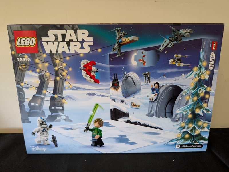 Lego Star Wars Advent Calendar 2024 (Set 75395) Featuring 24 Daily Gifts With Minifigures, Spacecraft, And Themed Accessories. Box Displays Festive Winter Scene With Decorated Christmas Tree, Various Star Wars Vehicles, And Characters. Includes Minifigures With Lightsabers And Buildable Star Wars Elements. Original Retail Packaging With Contents Layout Visible On Reverse.