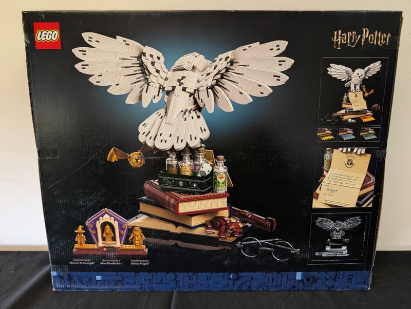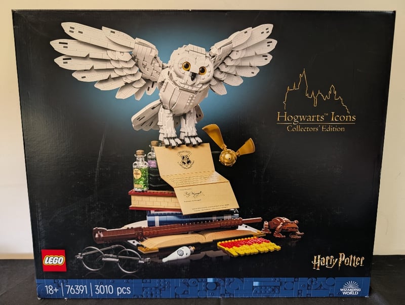 Lego Harry Potter Hogwarts Icons Collectors' Edition (Set 76391) Featuring A Meticulously Crafted White Buildable Owl (Hedwig) With Articulated Wings And Golden Eyes, Displayed Atop A Tiered Base Incorporating Hogwarts Books, Potion Bottles, A Wand, Glasses, And Iconic Wizarding Artifacts. Includes 3010 Pieces And Exclusive Anniversary Minifigures (Minerva Mcgonagall, Albus Dumbledore, Hagrid)