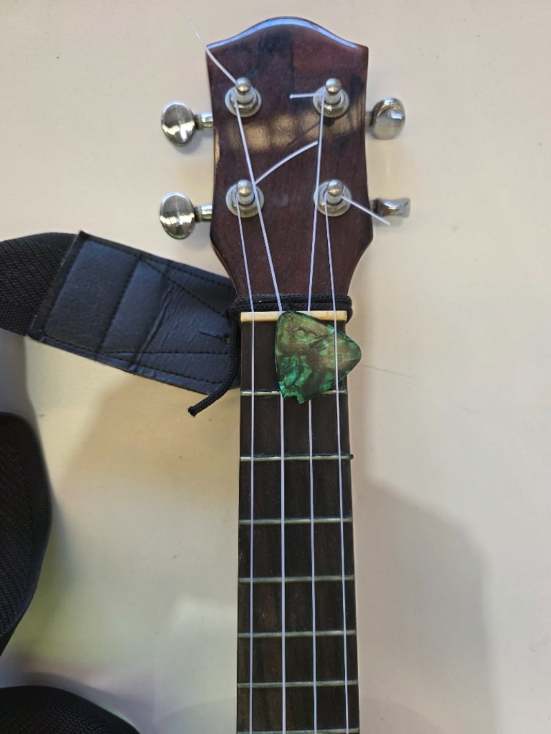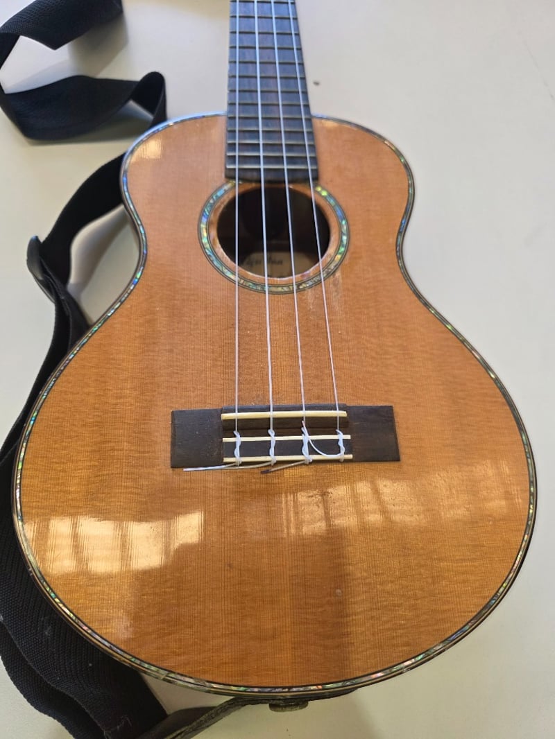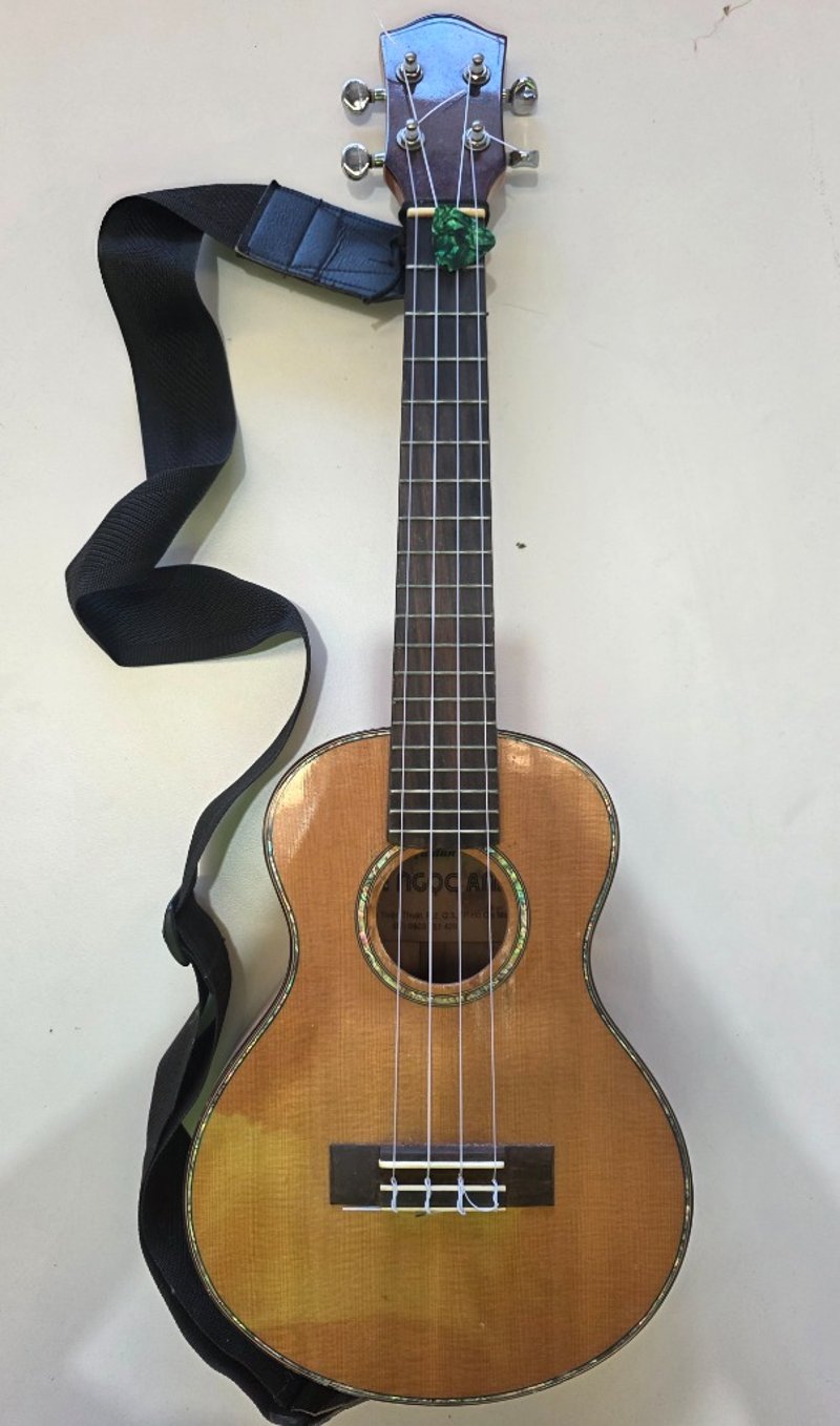 Tama Concert Series tenor ukulele featuring a natural wood body with warm honey-to-amber sunburst finish. Instrument displays excellent craftsmanship with bound edges and decorative rosette around the sound hole. Dark rosewood fingerboard with clear fret markers. Headstock features dark wood veneer with chrome tuning pegs in excellent condition. Includes original blue fabric shoulder strap. The ukulele shows signs of age and use with minor surface wear consistent with vintage instruments. Sound hole label indicates "Tama Concert" branding. Overall construction appears solid with no visible cracks or structural damage. A quality mid-range tenor ukulele suitable for intermediate to advanced players.