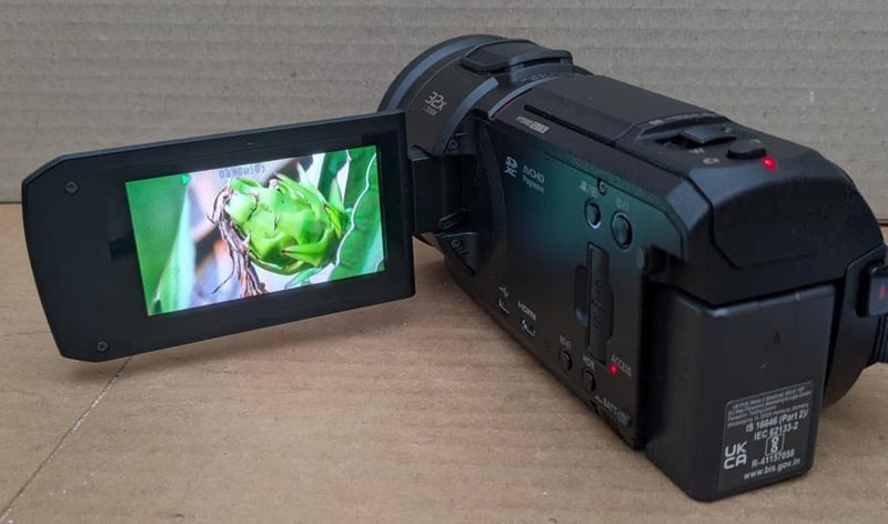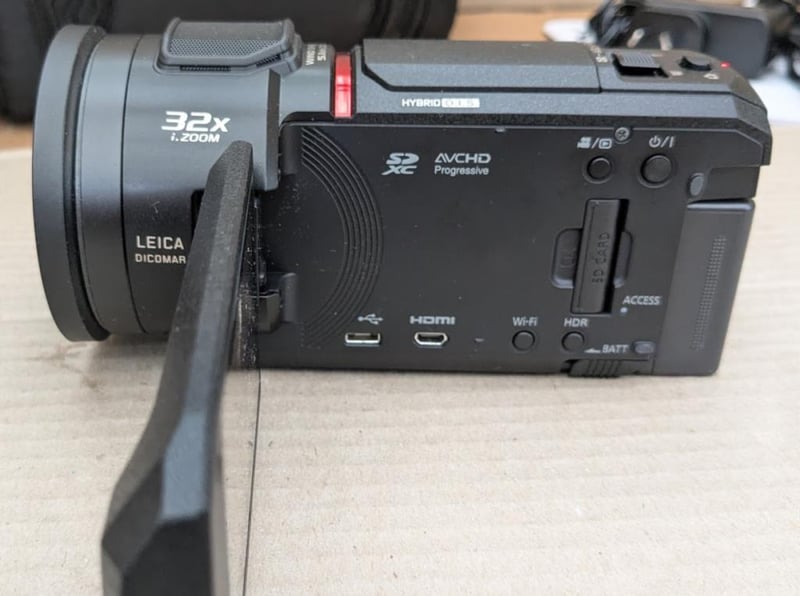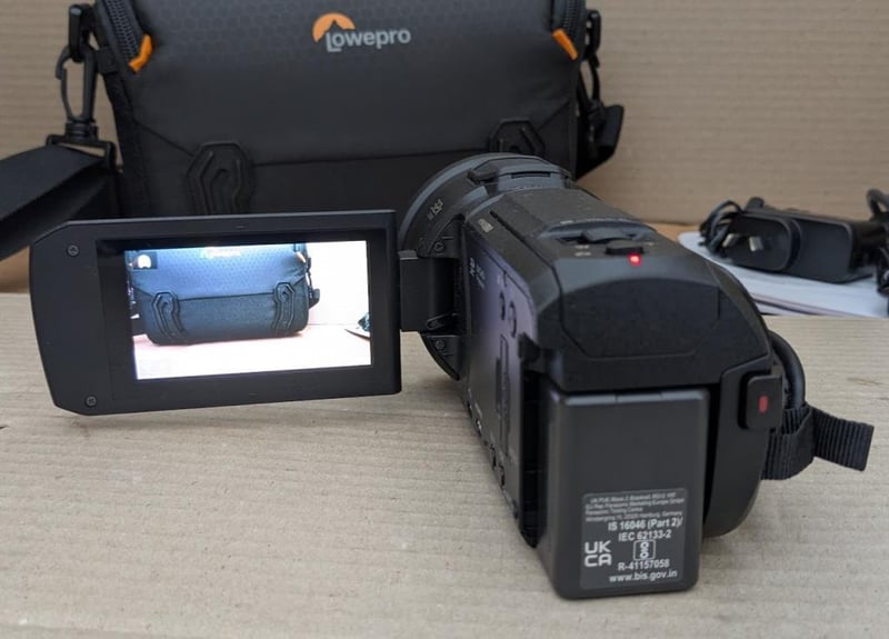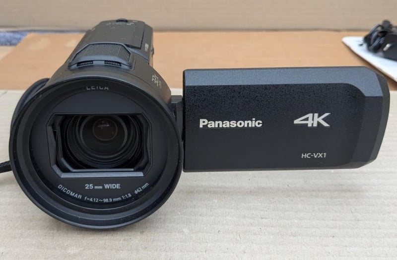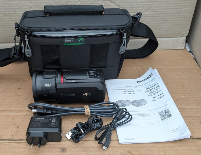 Panasonic HC-VX1 4K Ultra HD Camcorder, battery charger, HDMI and cords, manual, 128GB memory card and Lowepro camera bag