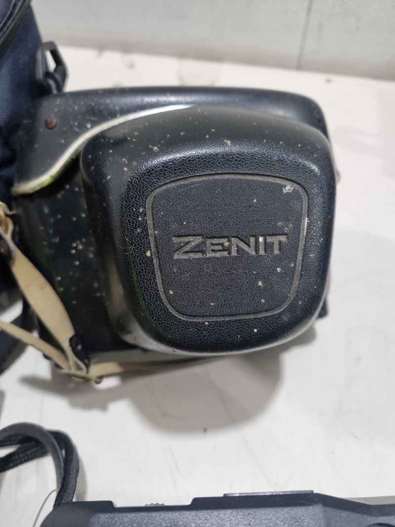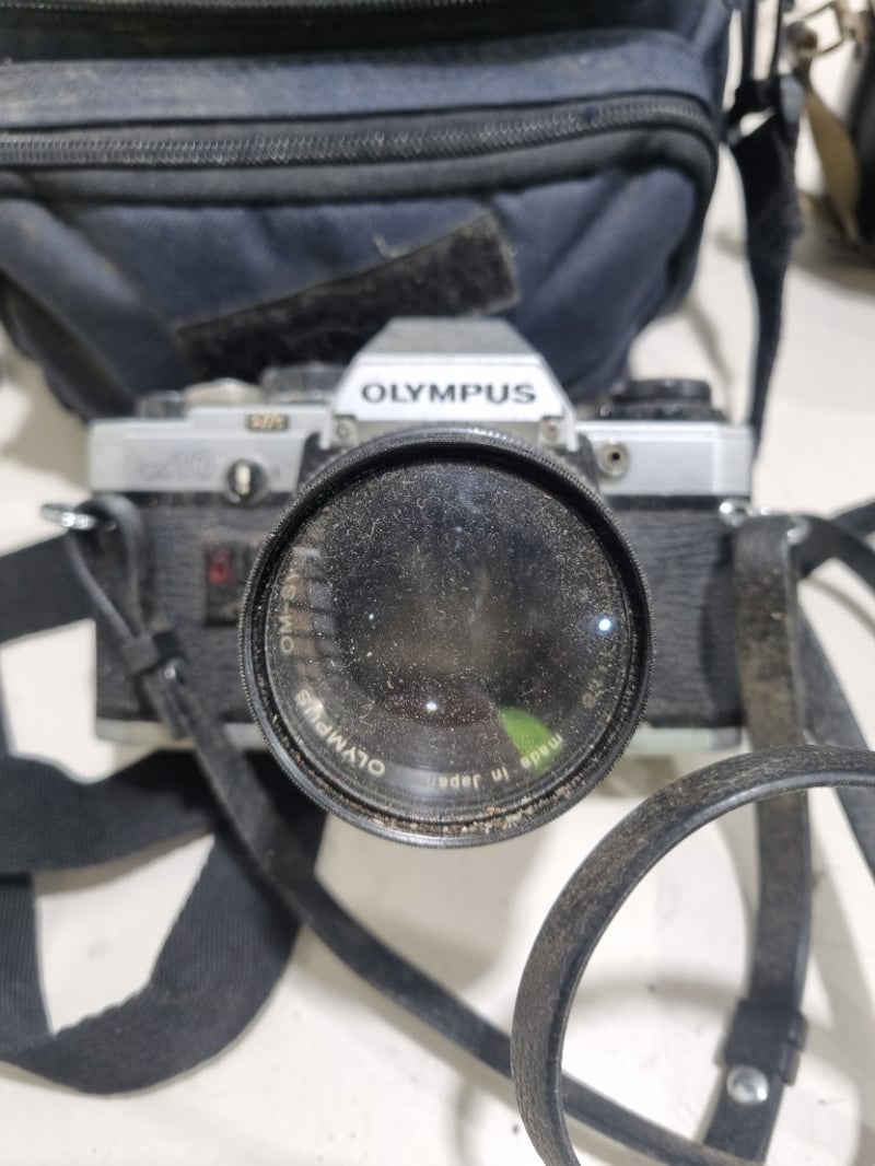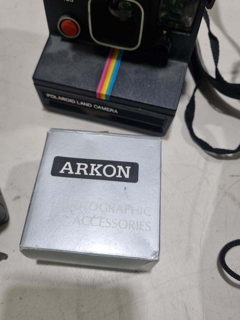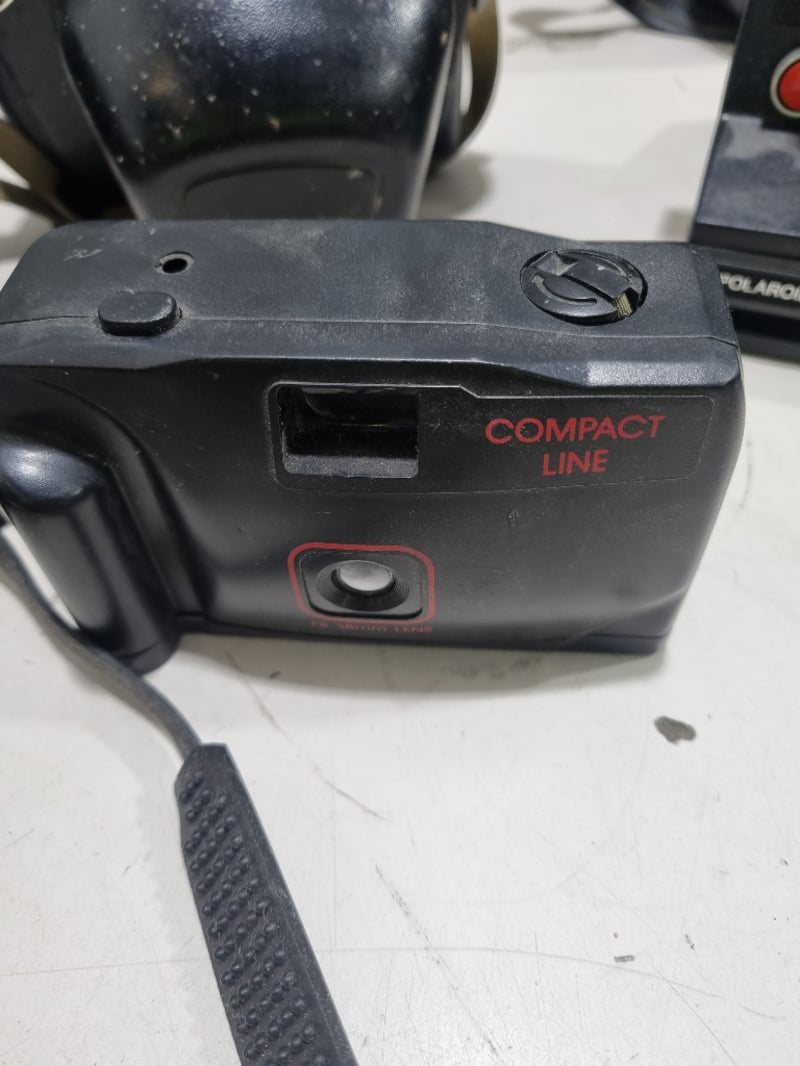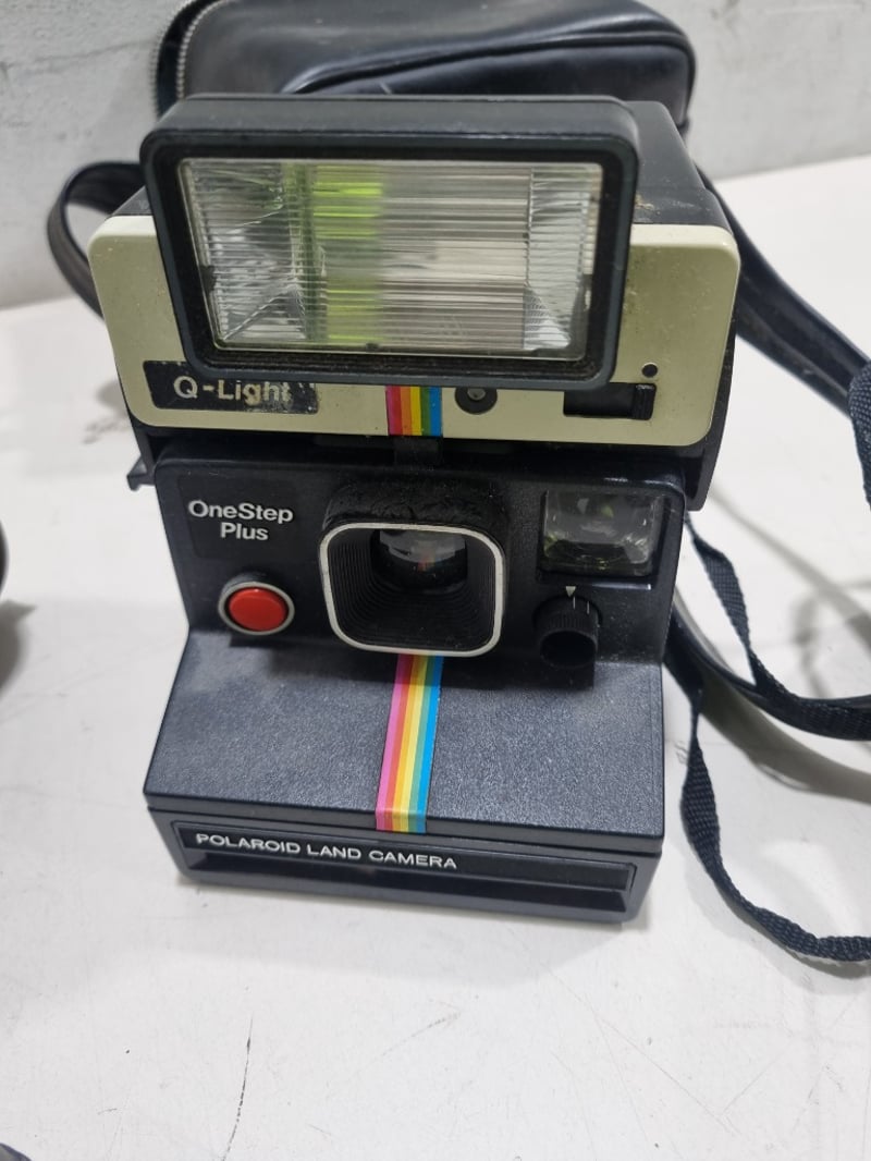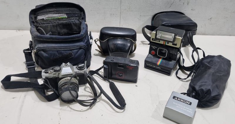 Comprehensive camera collection featuring six pieces from the 1970s-1980s era. Centrepiece is an Olympus film SLR camera with Olympus lens and shoulder strap. Accompanying items include a Zenith compact camera in original case, Polaroid OneStep Plus instant camera with Q-Light flash attachment, compact 35mm point-and-shoot camera, and a second compact film camera.Sold as lot Note: untested, signs of wear