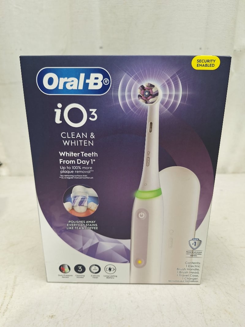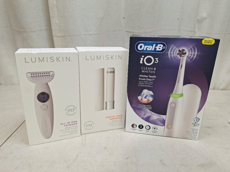 1 x ORAL-B iO3 clean & whiten electric toothbrush, RRP$100.00, NEW factory sealed in box, 1 x LUMISKIN facial hair remover 1, water resistant IPX5 technology,RRP$35.00, NEW factory sealed in box, 1 x LUMISKIN All In One trimmer, water resistant IPX7 technology, perfect for full body & face, NEW in box