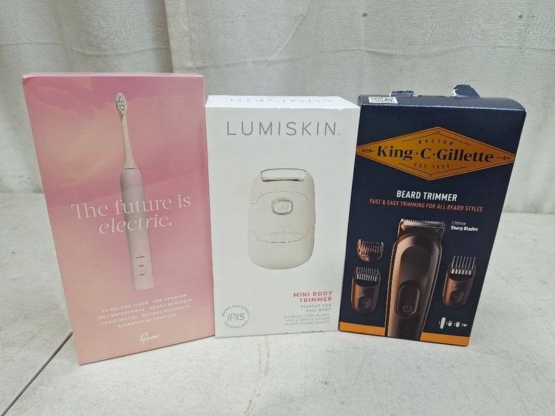 King C Gillette Beard trimmer, lifetime sharp blades, 4 pieces, factory sealed in box, LUMISKIN mini body trimmer, water resistant techm ipx5, factory sealed in box, GEM electric toothbrush, factory sealed in box