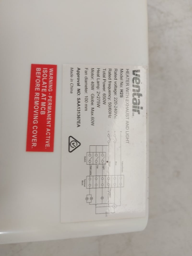 Heater with Exhast And Light, Ventair, Model: H2S,