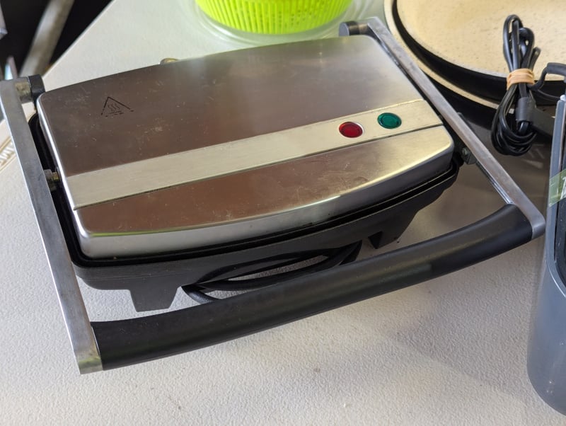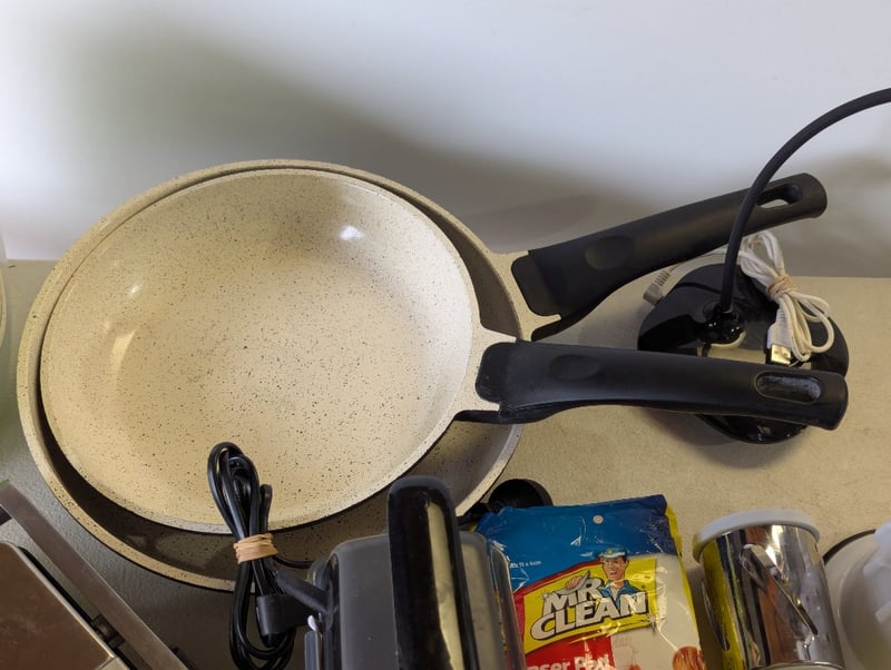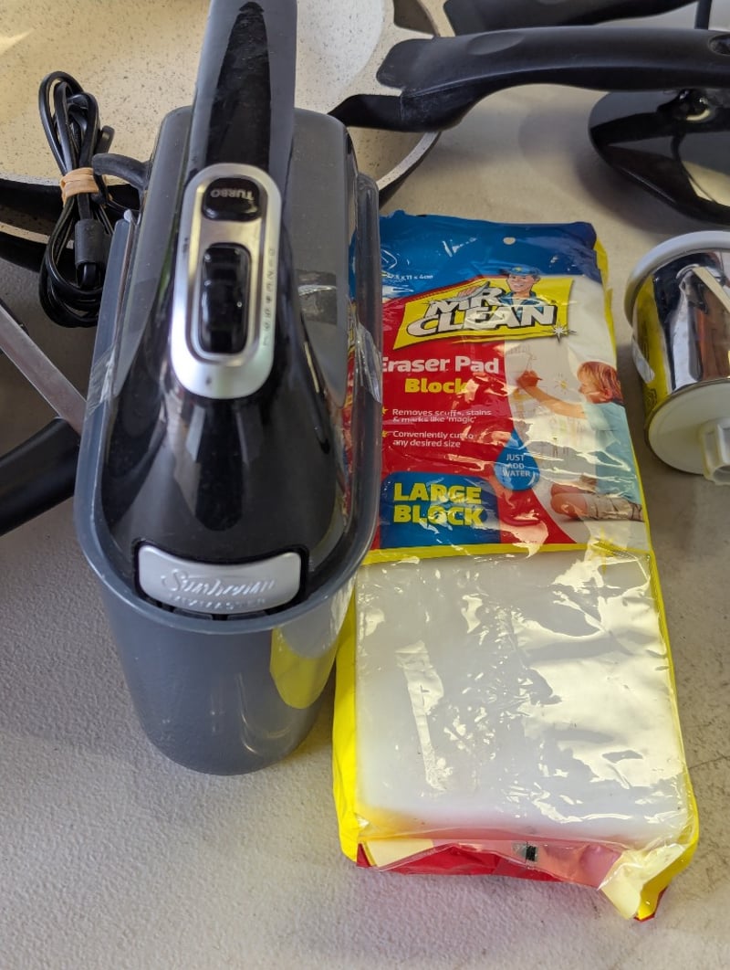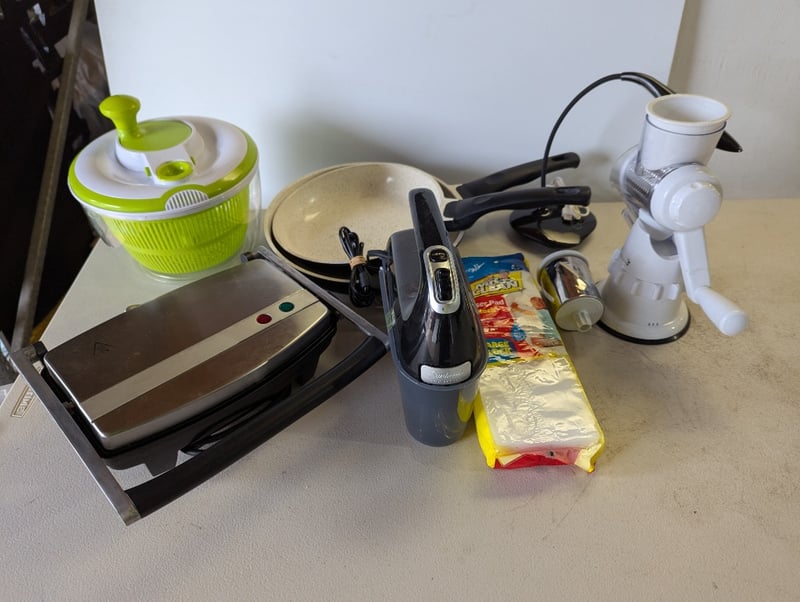 Assorted kitchenware, includes frypans, sandwich press, mix master and moreSOLD AS LOT
