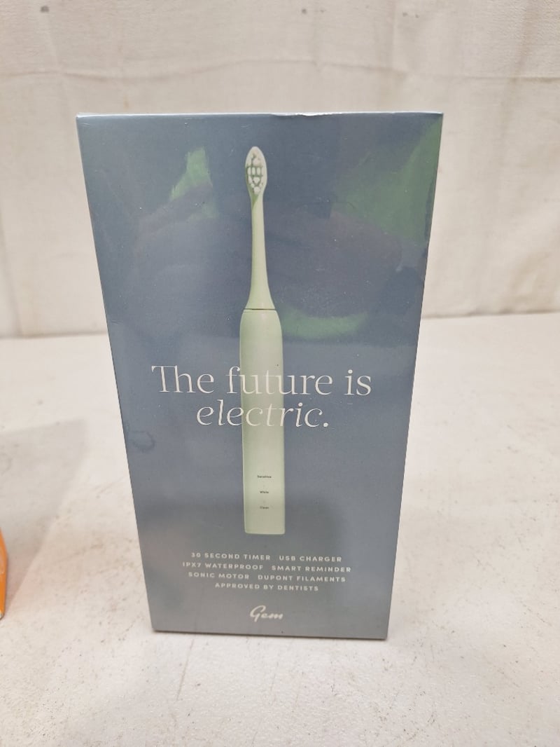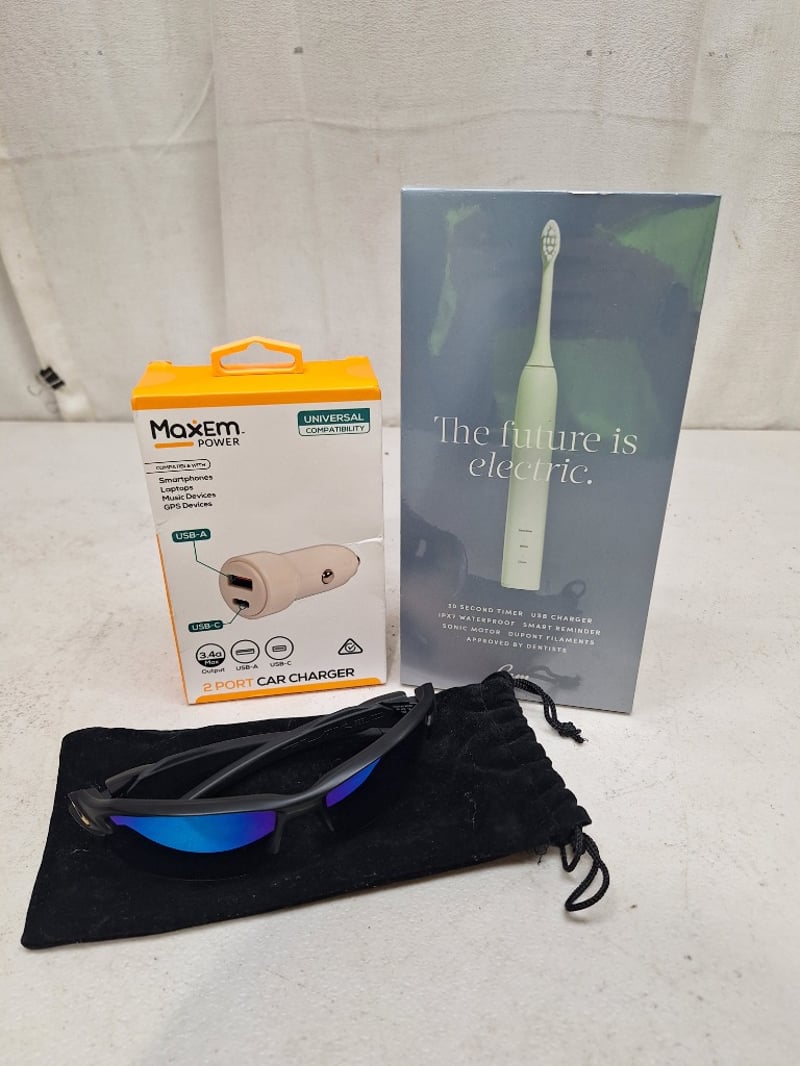 1x OAKLEY flak 2.0 XL sunglasses, matte black frame and prizm sapphire blue lenses, comes with pouch, 1x GEM electric toothbrush in mint green, factory sealed in box, 1x MAXEM power 2 port car charger, universal compatibility, USB-A and USB-C,Factory sealed in box