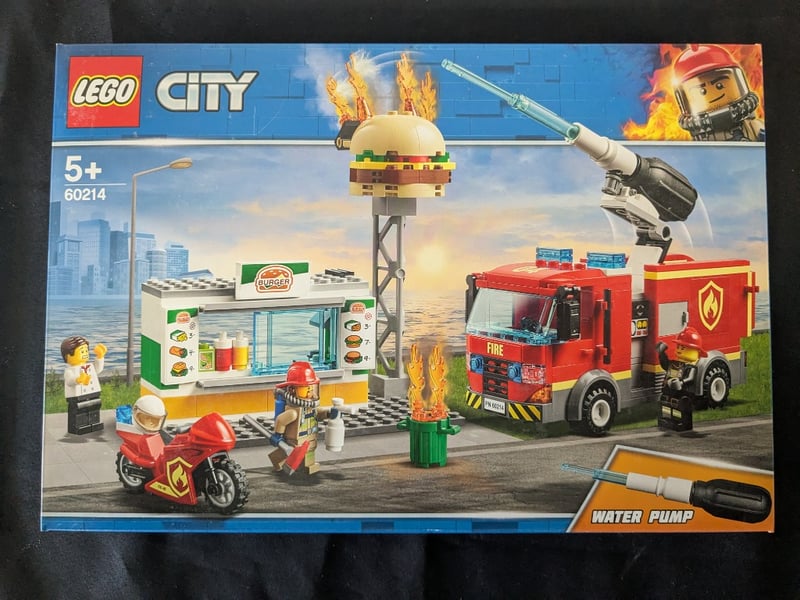 Lego City Set 60214 Featuring A Detailed Fire Emergency Scene With Functioning Burger Shop Kiosk, Motorized Fire Truck With Extendable Ladder, Fire Motorcycle, And Water Pump Accessory. Includes Multiple Minifigures And Flame Elements.