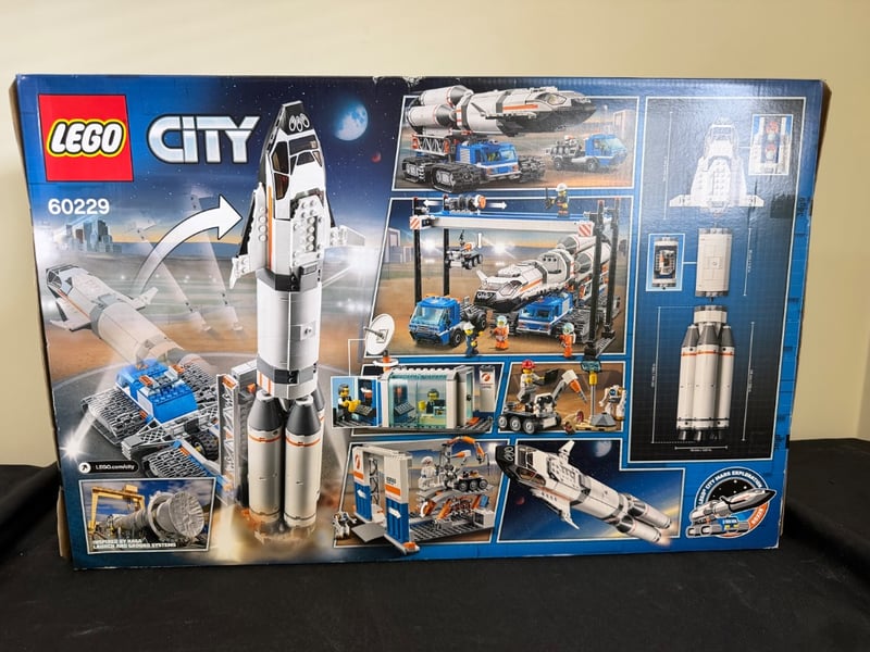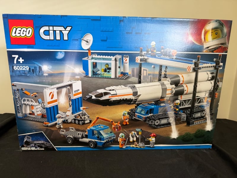 Lego City Space Rocket Launch Center Set 60229, Featuring A Detailed Rocket With Detachable Payload Module, Mission Control Building, Launch Platform With Gantry Crane, Support Vehicles Including Blue Cargo Truck And Tracked Transporter, Satellite Dish. Complete With Structural Elements, Ground Support Equipment, And Accessories. Age Rating 7+.