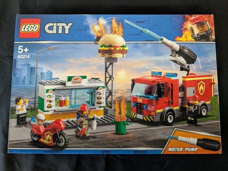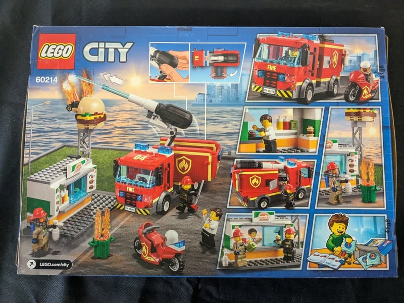 Lego City Set 60214 Featuring A Detailed Fire Station Scene With Motorized Fire Truck, Burger Stand Kiosk, Fire Motorcycle, Water Pump Cannon, And Multiple Minifigures. Includes Buildable Structures And Interactive Play Elements Depicting An Urban Emergency Response Scenario.